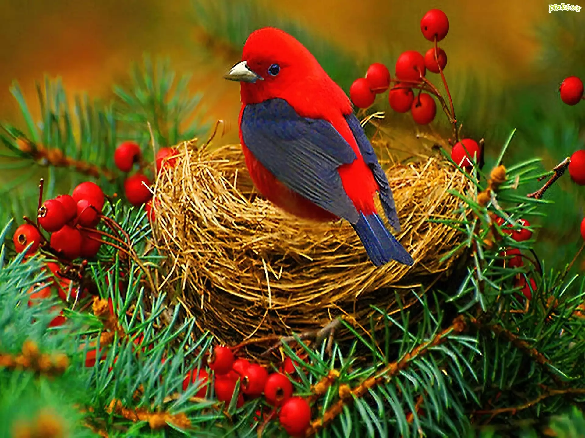 Gniazdo, Czerwono, Niebieski, Ptak, Jarzębina