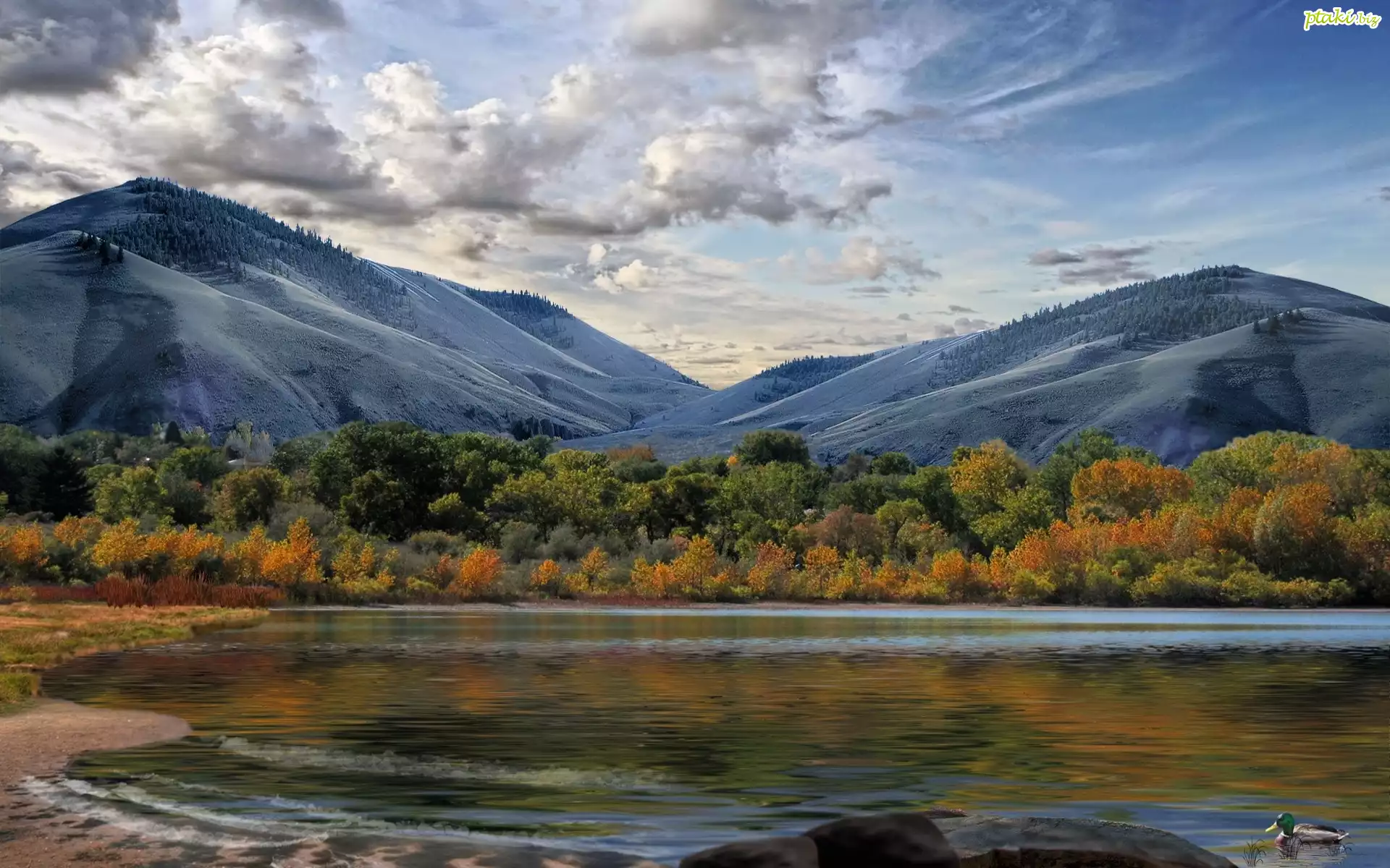 Góry, Śnieg, Jezioro, Kaczka, Drzewa