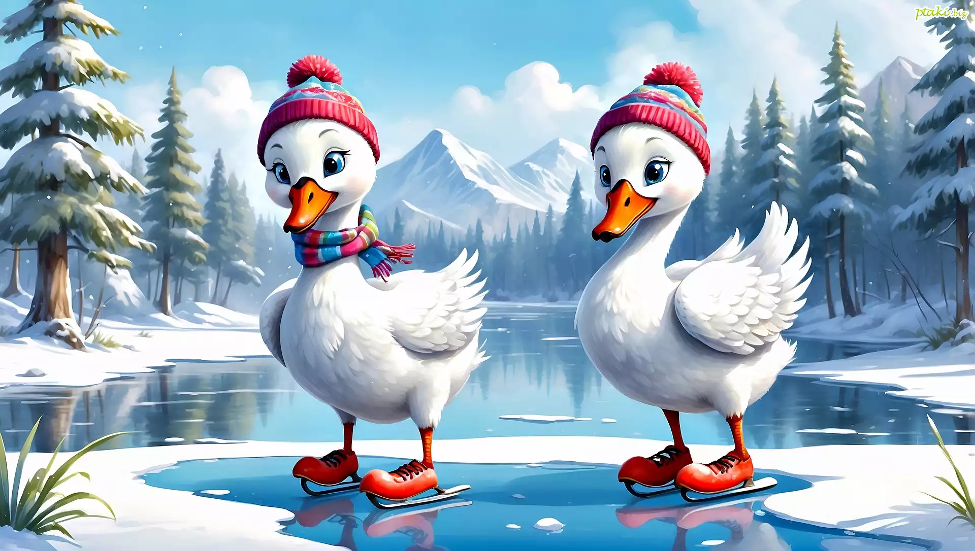 Grafika, Kaczki, Czapki, Łyżwy, Zima, Góry, Drzewa, Jezioro, 2D