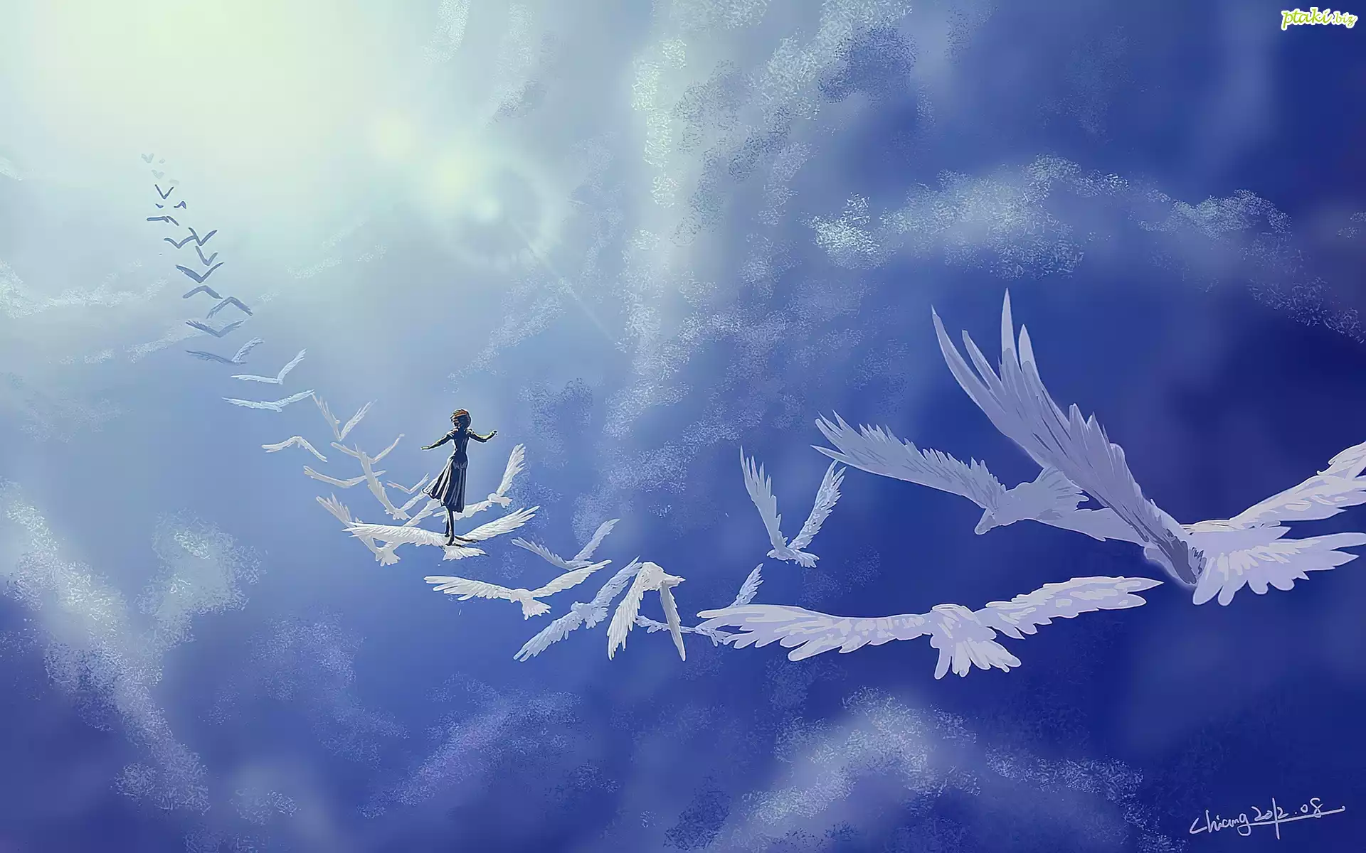 Grafika, Niebo, Schody, Dziewczyna, Ptaki