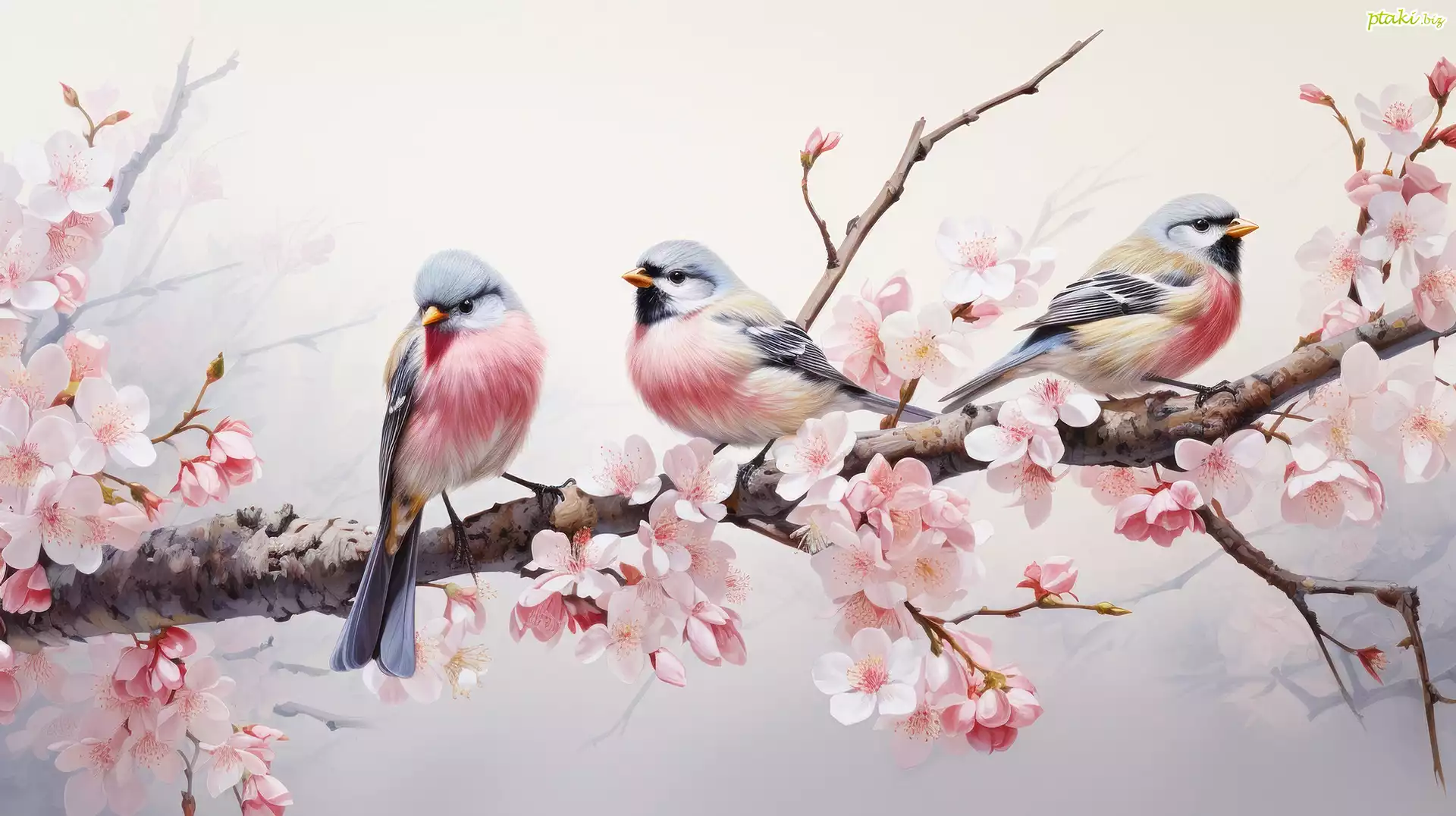 Trzy, Ptaki, Gałąź, Różowe, Kwiaty, Drzewo owocowe, Grafika