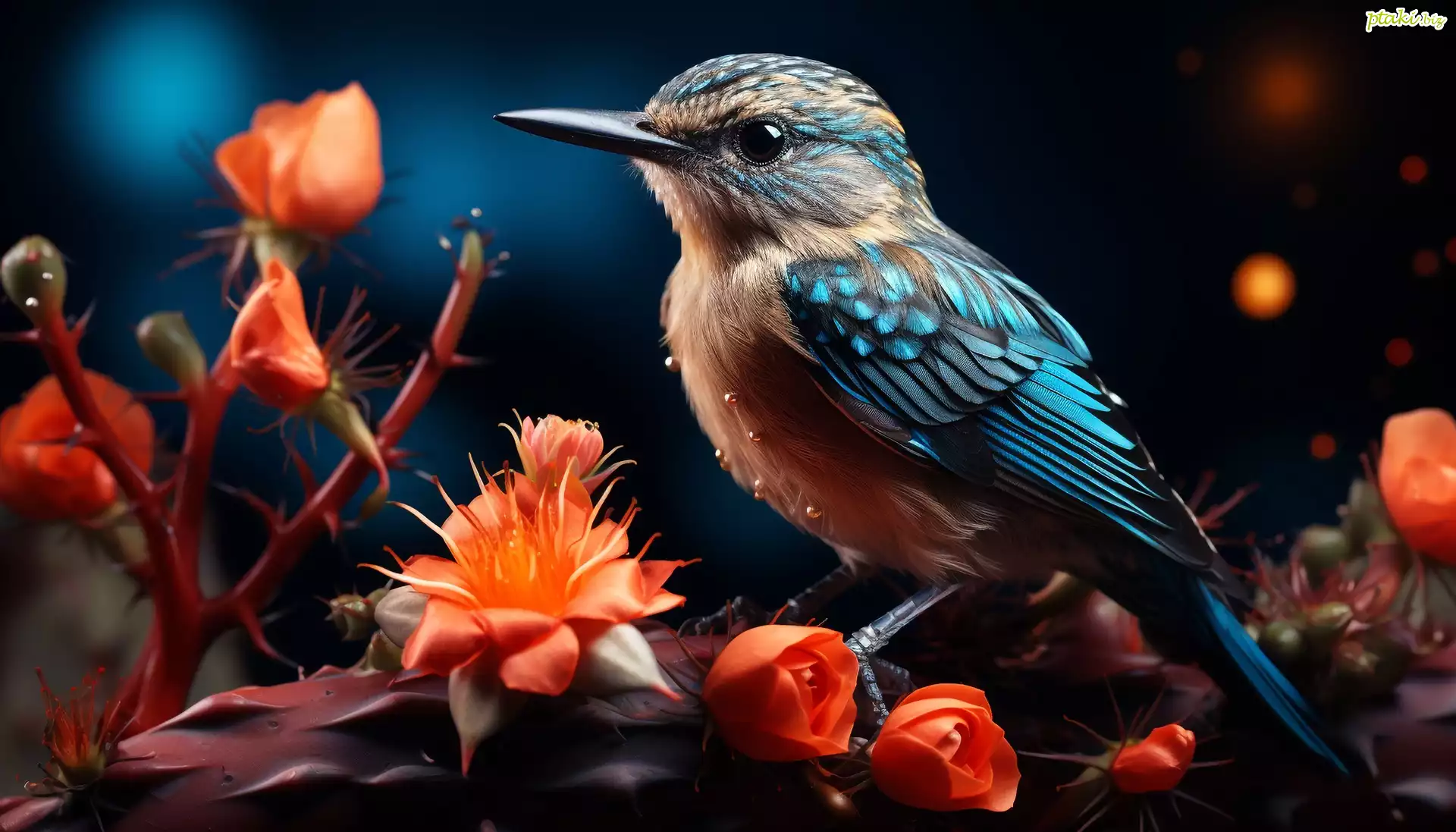 Ptak, Pomarańczowe, Kwiaty, Grafika