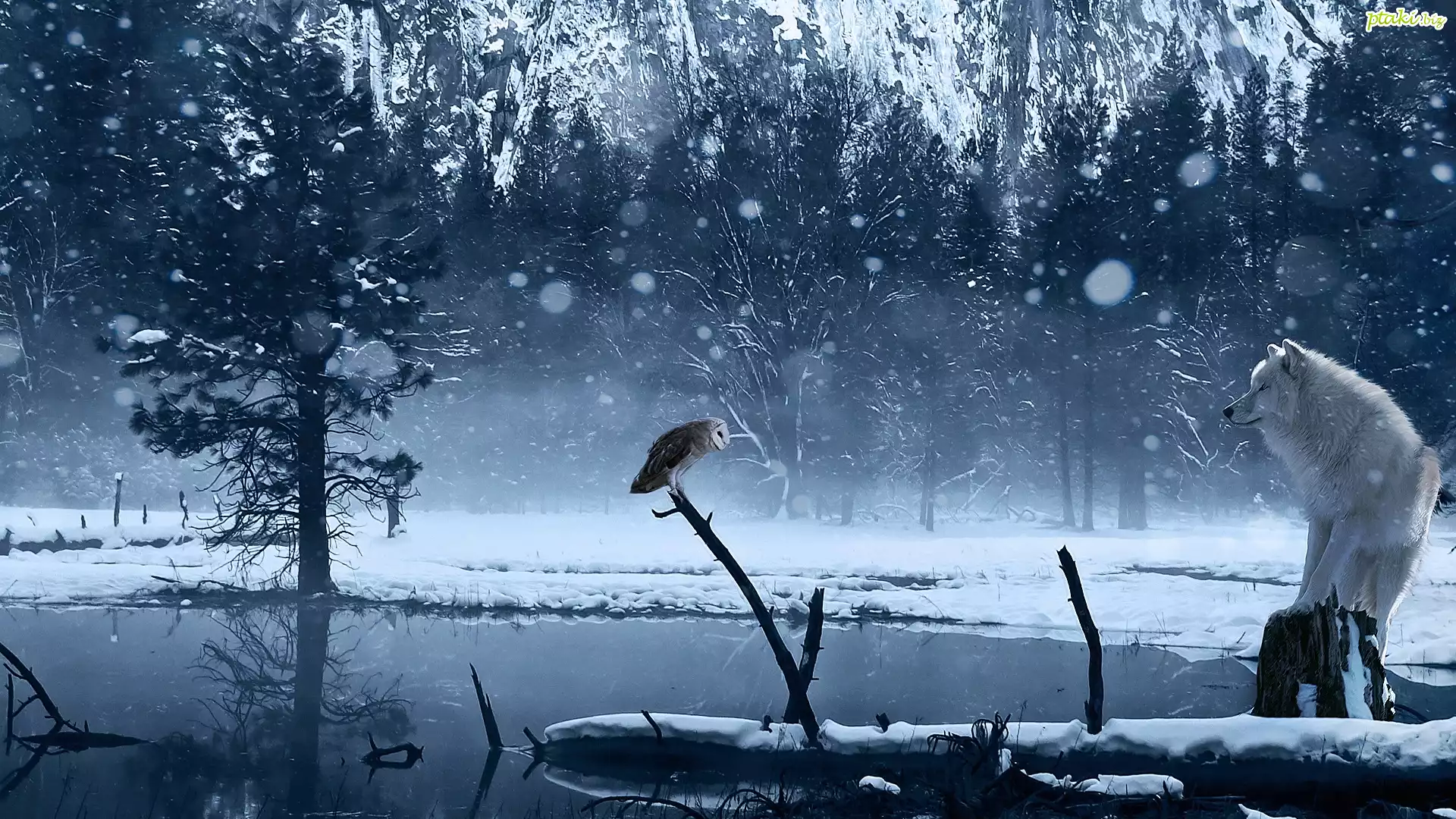 Grafika, Zima, Wilk, Sowa
