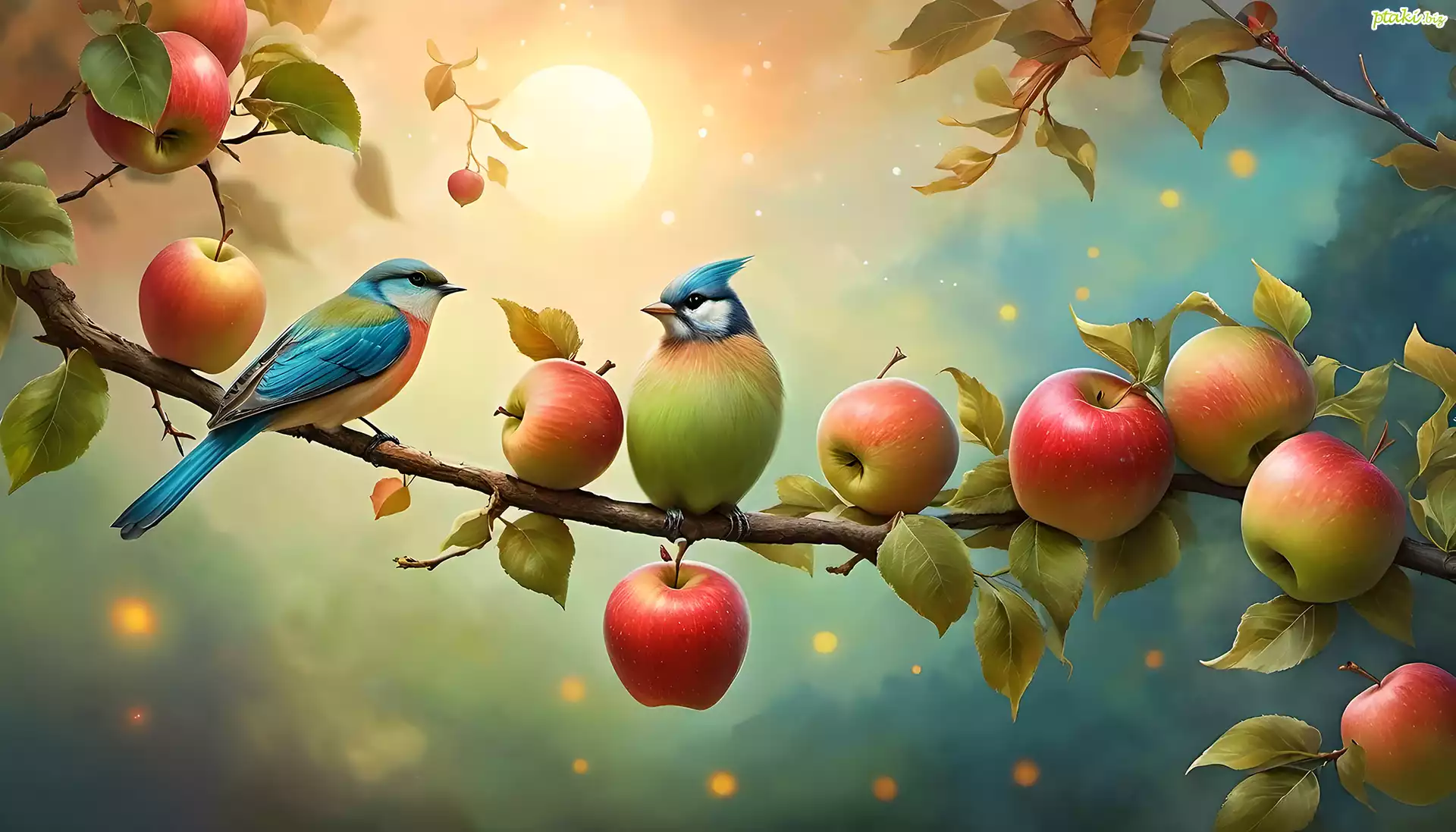 Dwa, Kolorowe, Ptaki, Jabłka, Gałązka, Grafika
