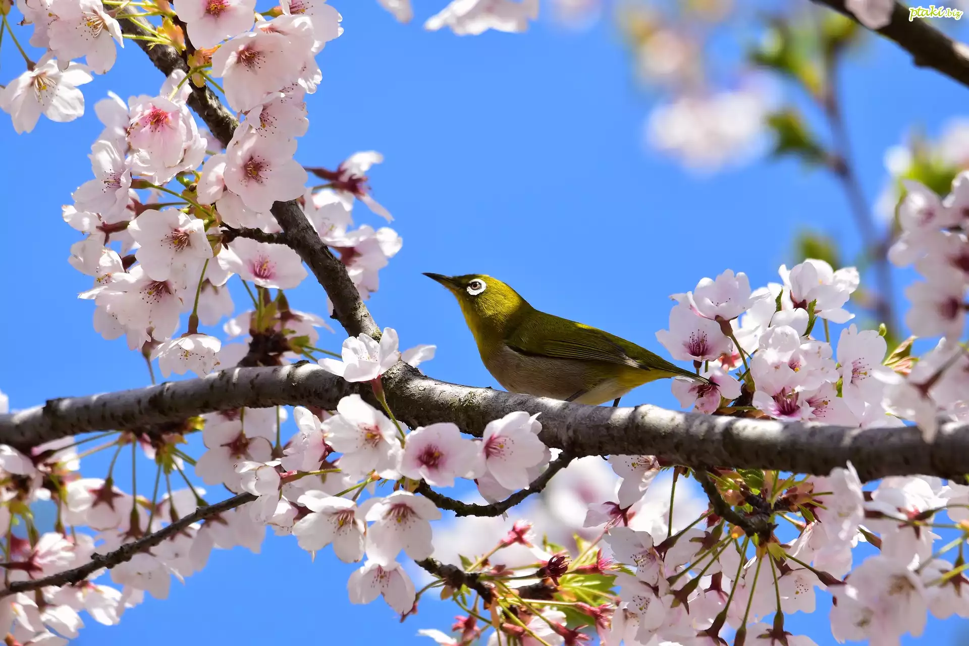 Okwiecone, Drzewo owocowe, Wiśnia, Różowe, Kwiaty, Ptak, Szlarnik japoński