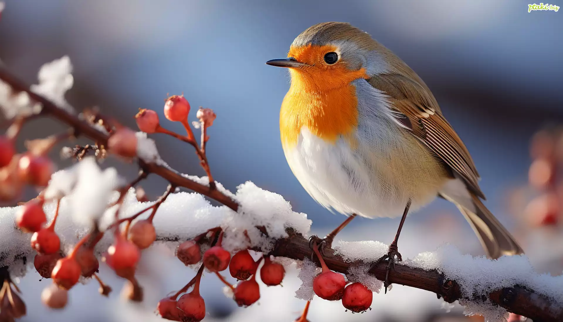 Zima, Ptak, Rudzik, Śnieg, Gałązka, Czerwone, Owoce, Jarzębina