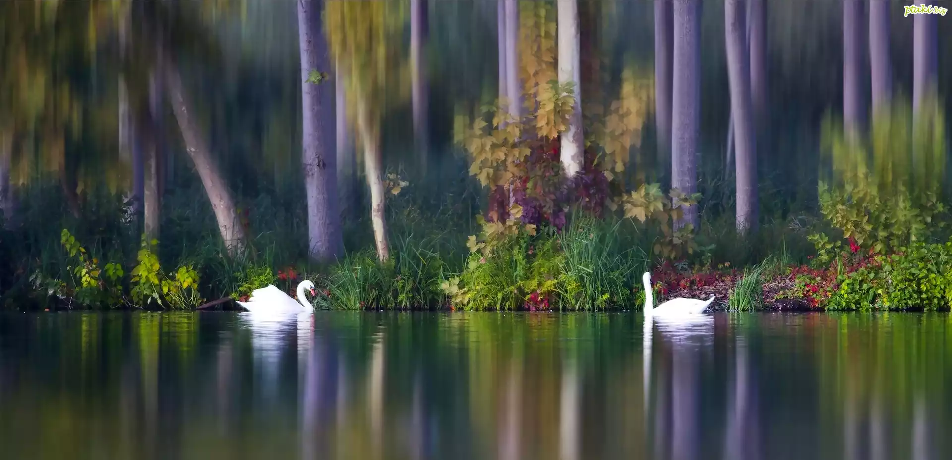 Jesień, Drzewa,Krzewy, Jezioro, Dwa, Łabędzie