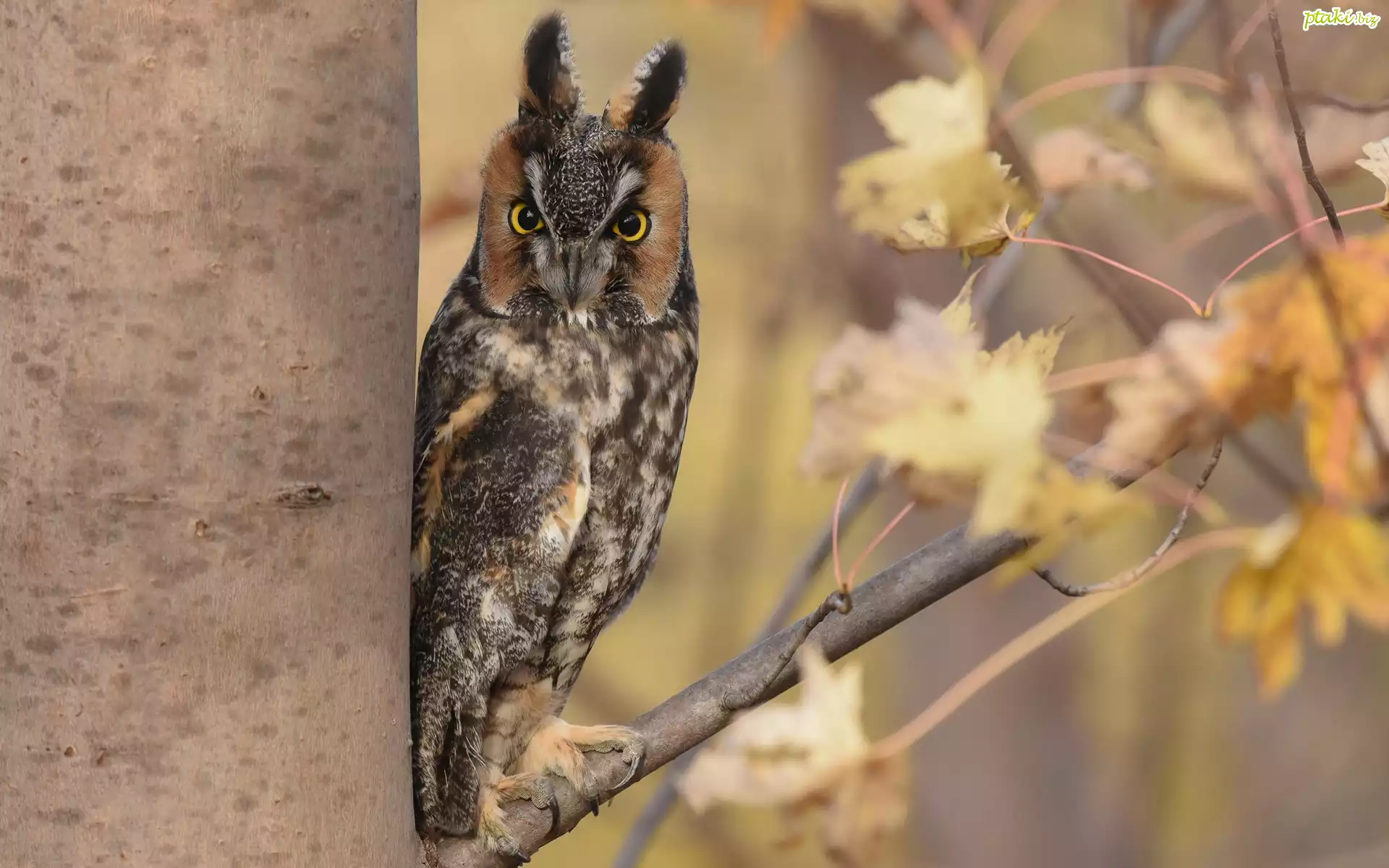 Ptak, Sowa uszata, Uszatka zwyczajna, Drzewo, Gałąź, Liście, Jesień