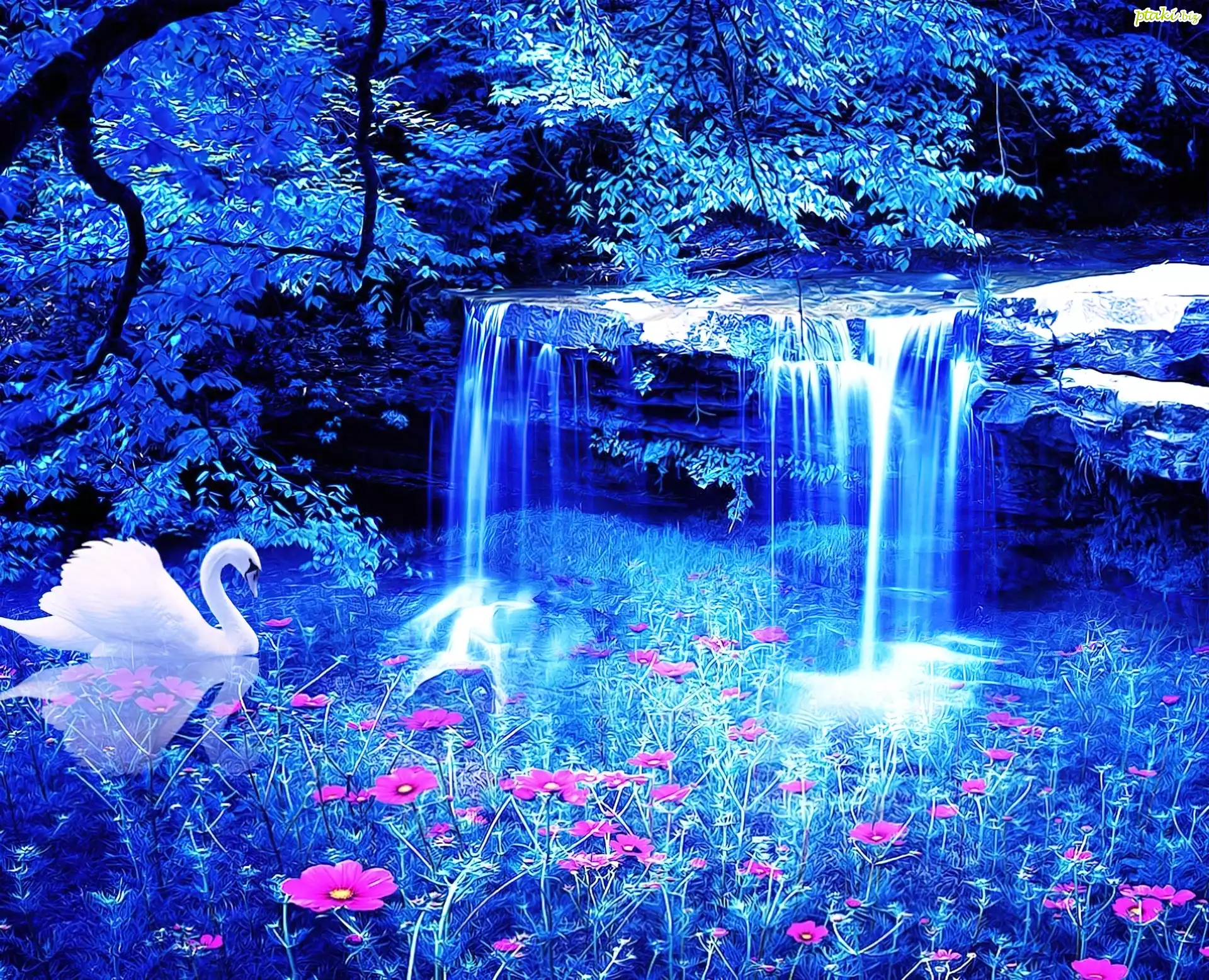 Łabędz, Wodospad, Jeziorko, Kwiatki