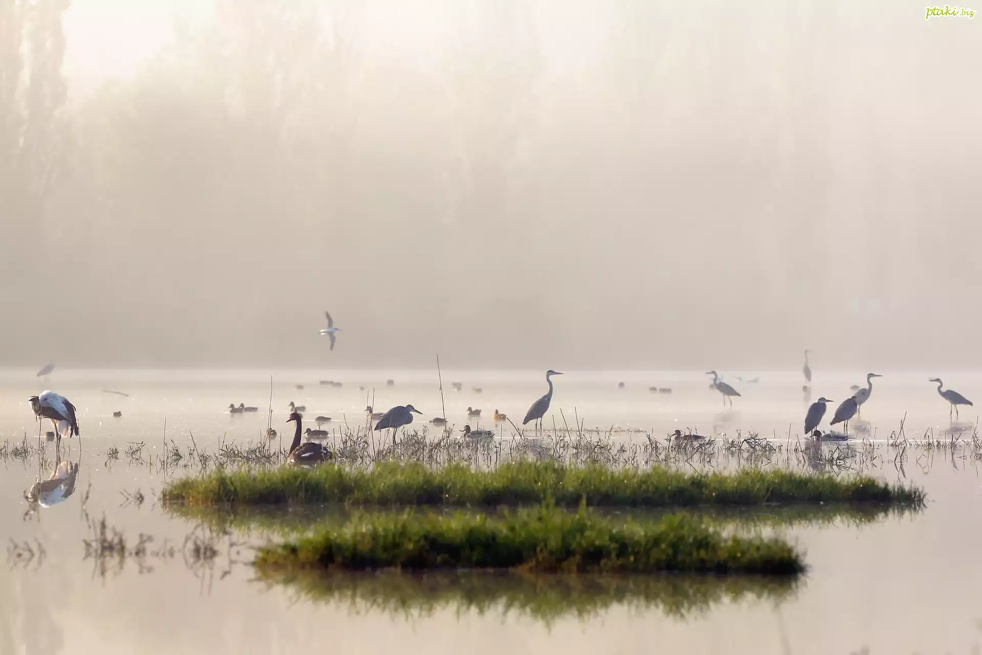 Jezioro, Mgła, Ptaki, Czaple, Kaczki