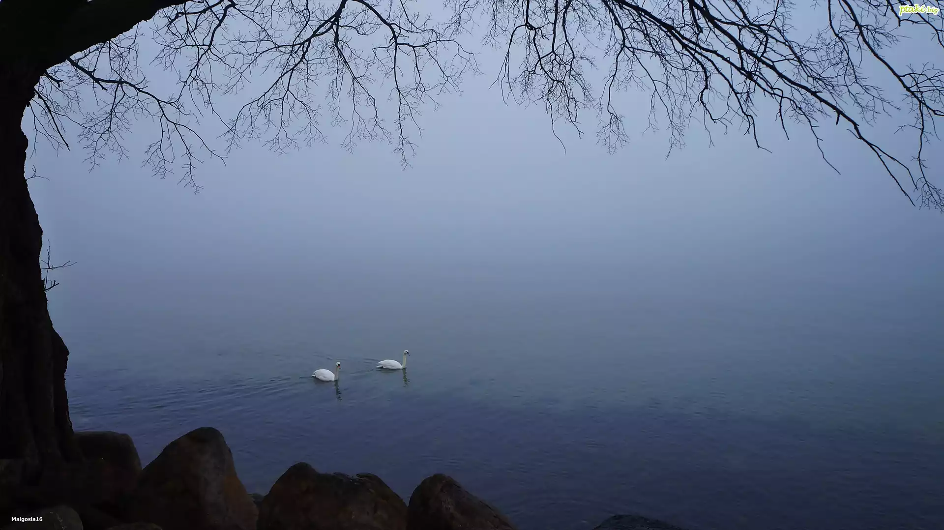 Jezioro, Łabędzie, Drzewo, Gałązki