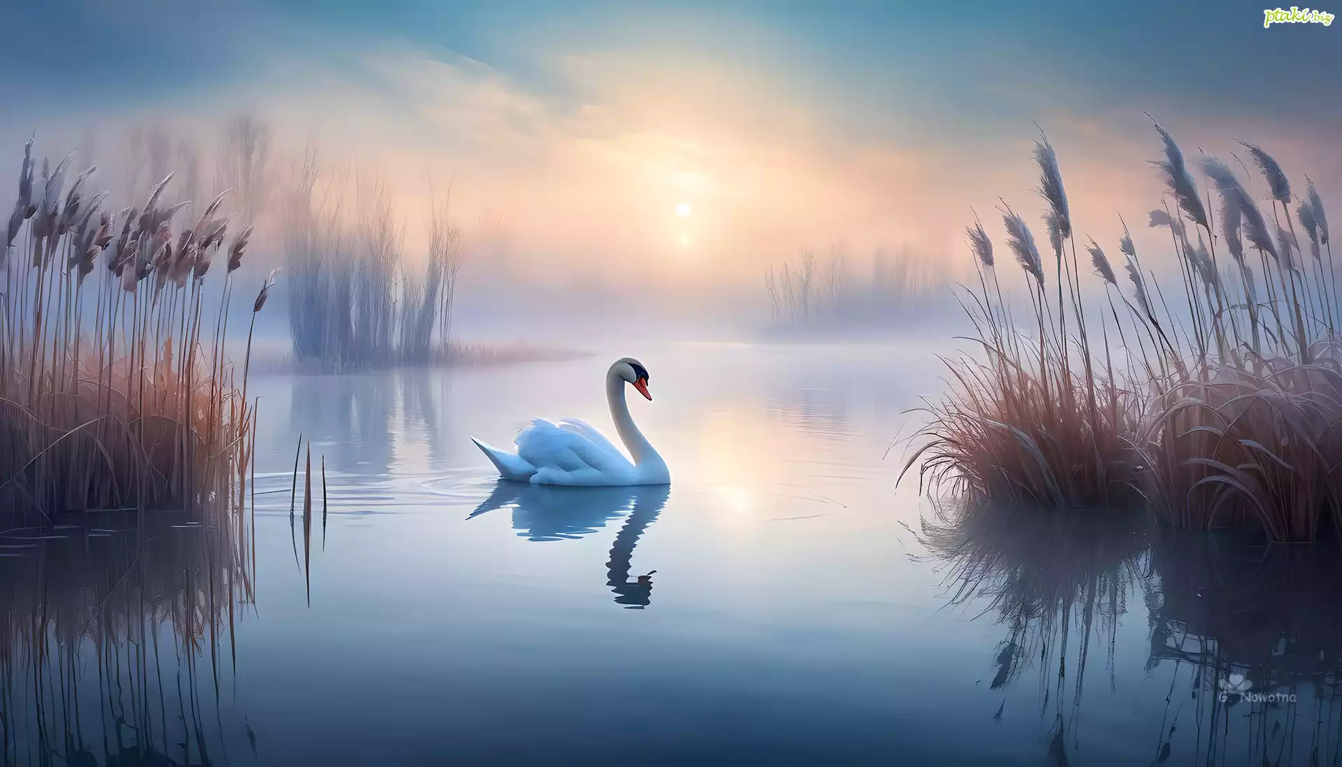 Łabędź, Jezioro, Mgła, Szuwary, Grafika