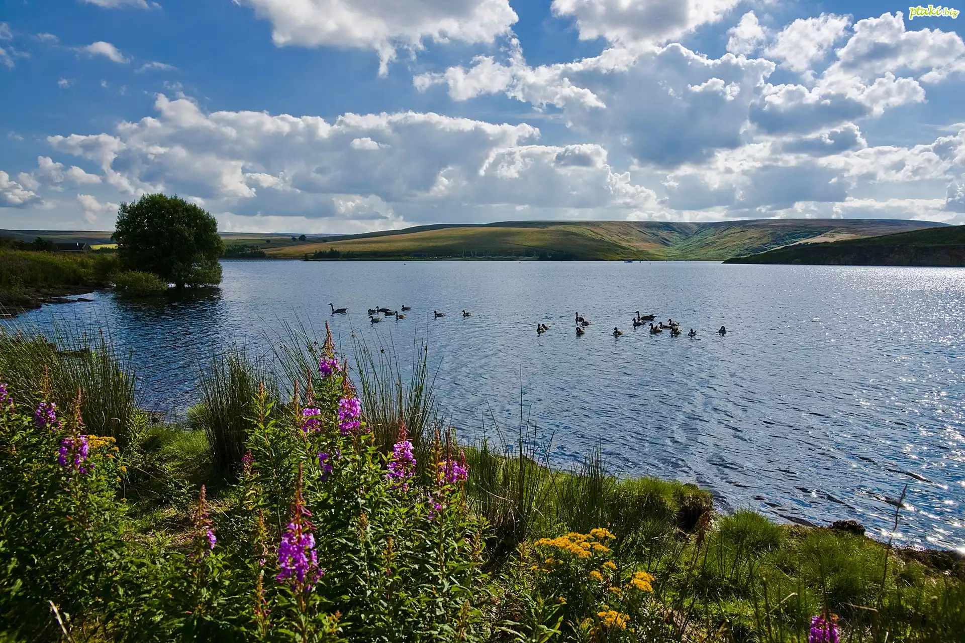 Jezioro, Ptaki, Polne, Kwiaty