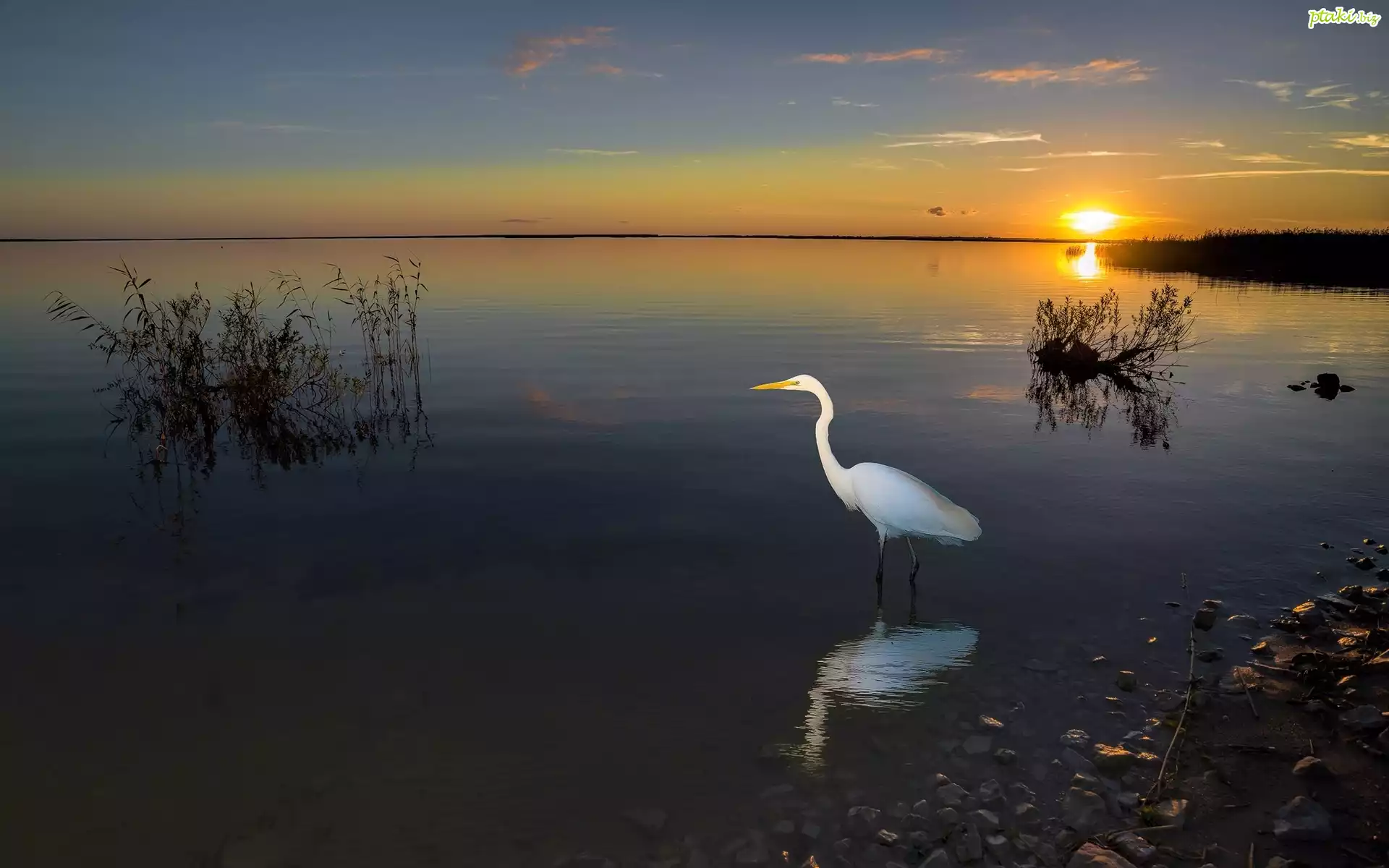 Jezioro, Zachód Słońca, Ptak, Czapla
