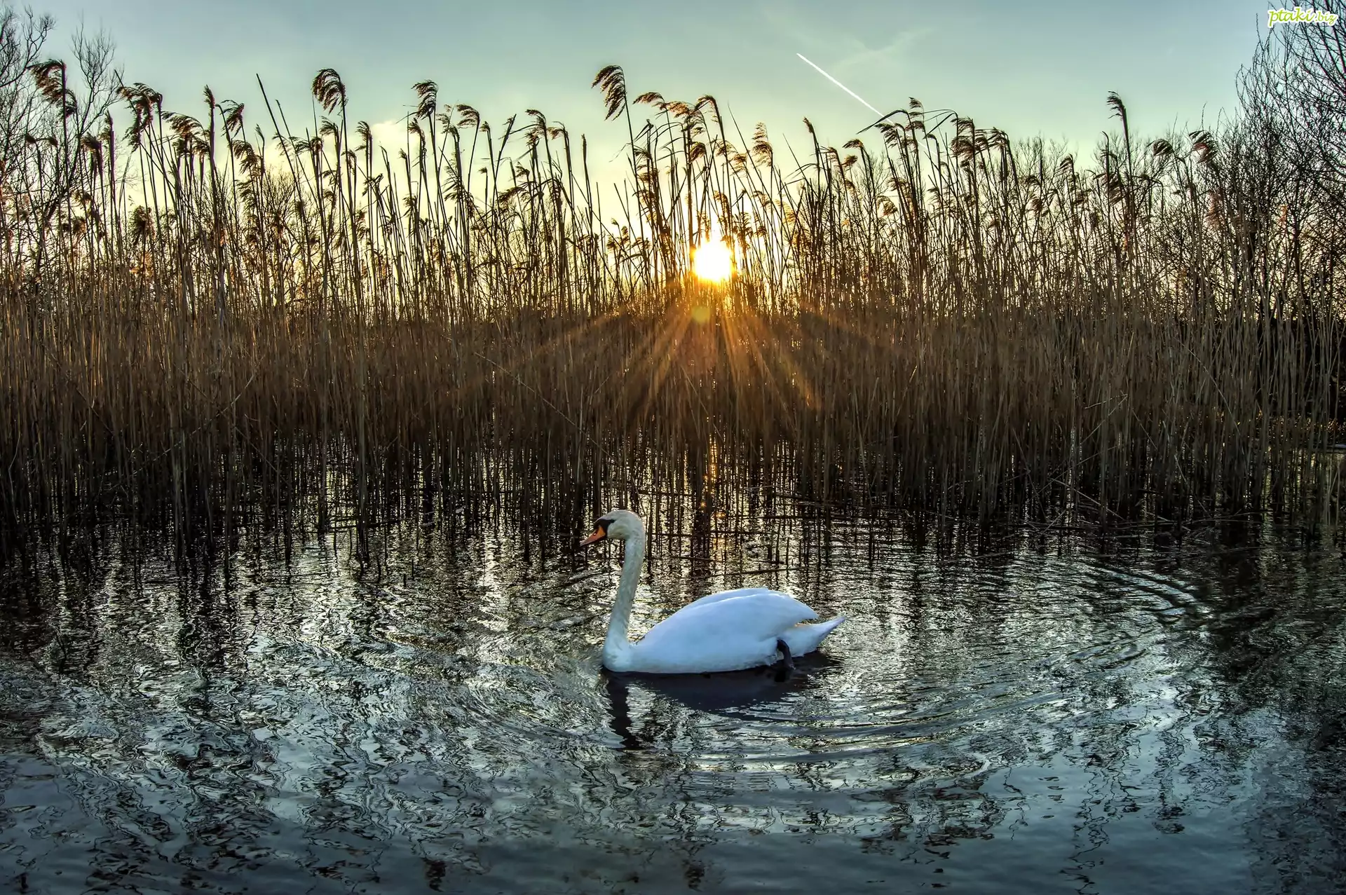 Jezioro, Trawy, Łabędź, Zachód, Słońca