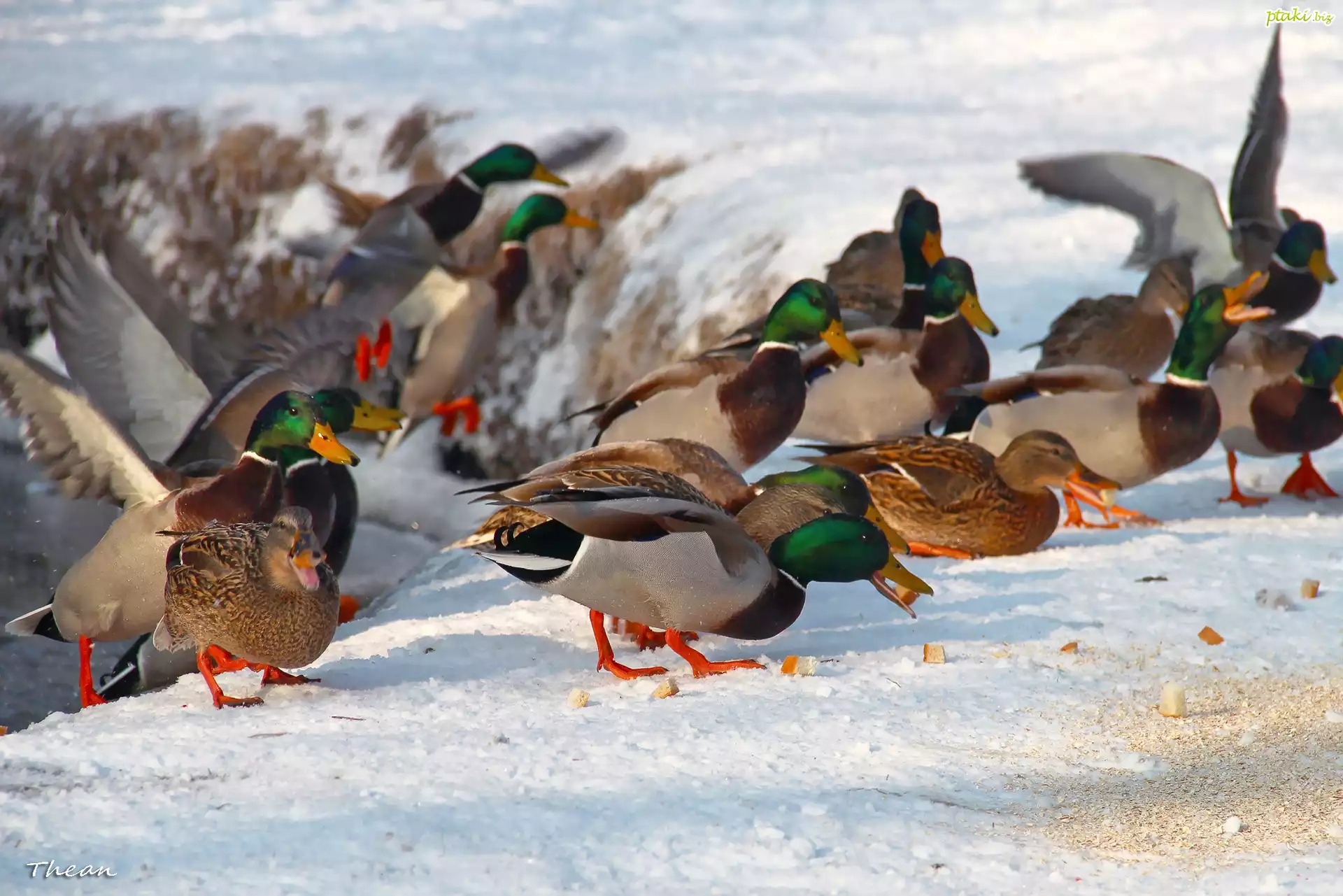Kaczki, Krzyżówki, Śnieg, Zima, Mróz