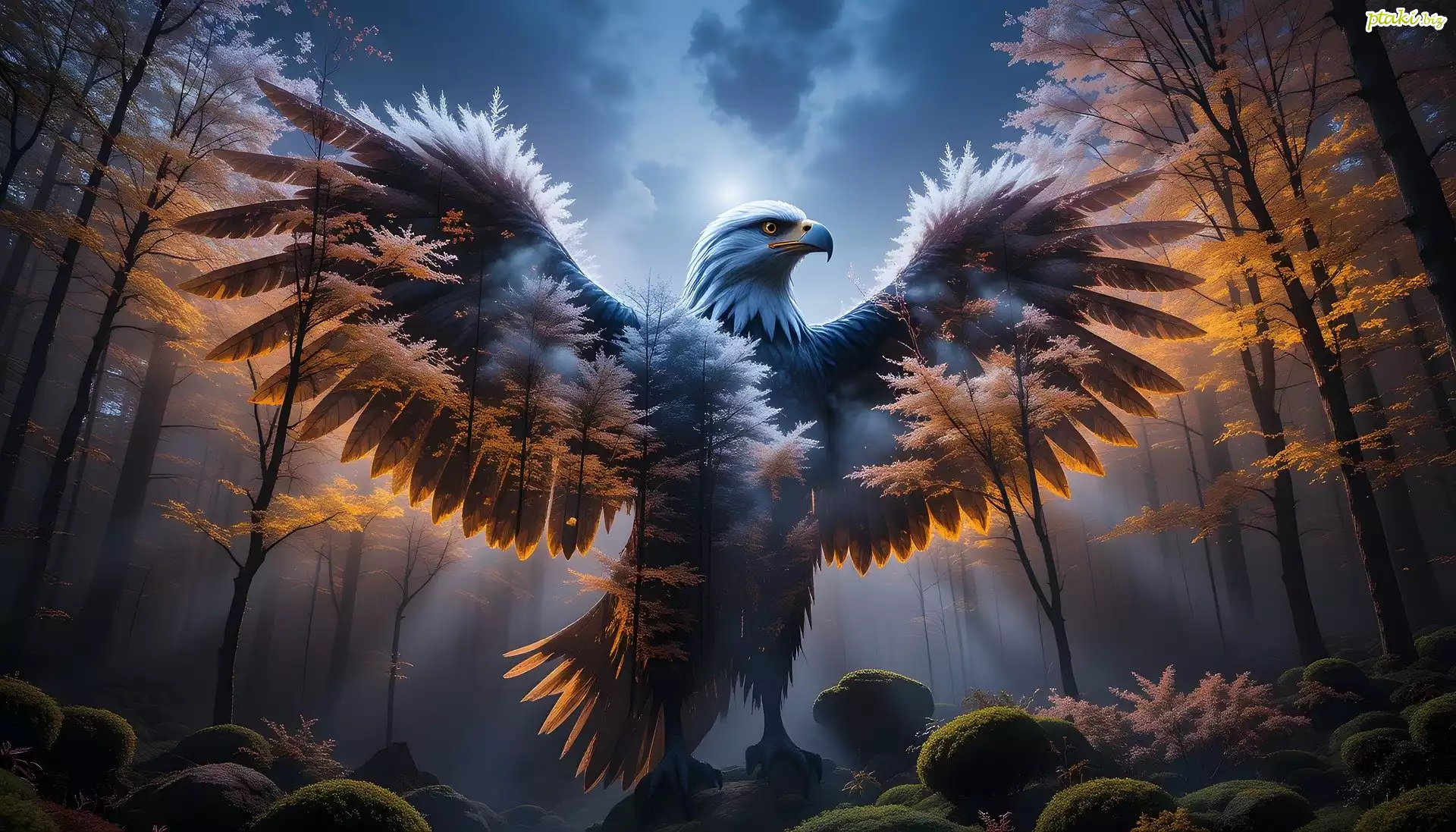 Krajobraz, Natura, Przyroda, Drzewa, Liście, Kamienie, Mech, Zielony, Ptak, Drapieżny, Orzeł, Skrzydła, Pióra, Podświetlenie, Światło, Mgła, Grafika, Komputerowa |