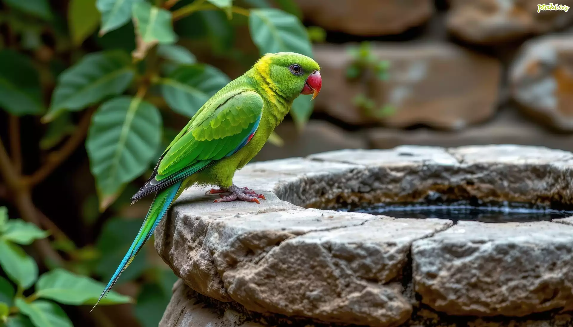 Papuga, Zielona, Ptak, Kamienne, Poidło, Grafika AI