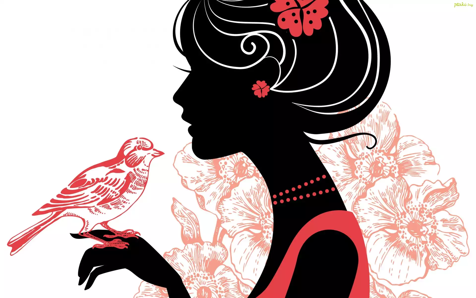 Kobieta, Ptaszek, Kwiaty, Grafika