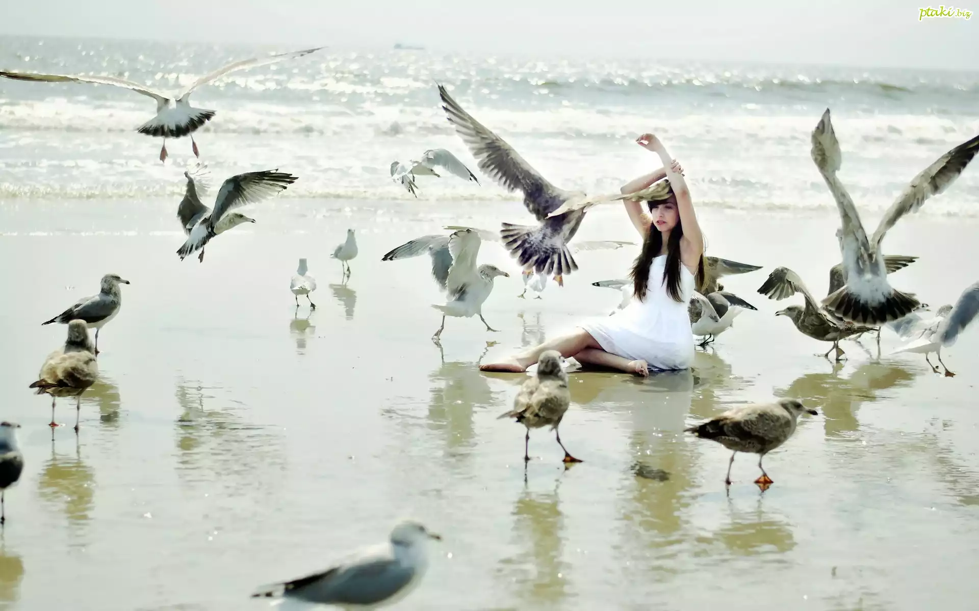 Kobieta, Biała, Sukienka, Mewy, Plaża