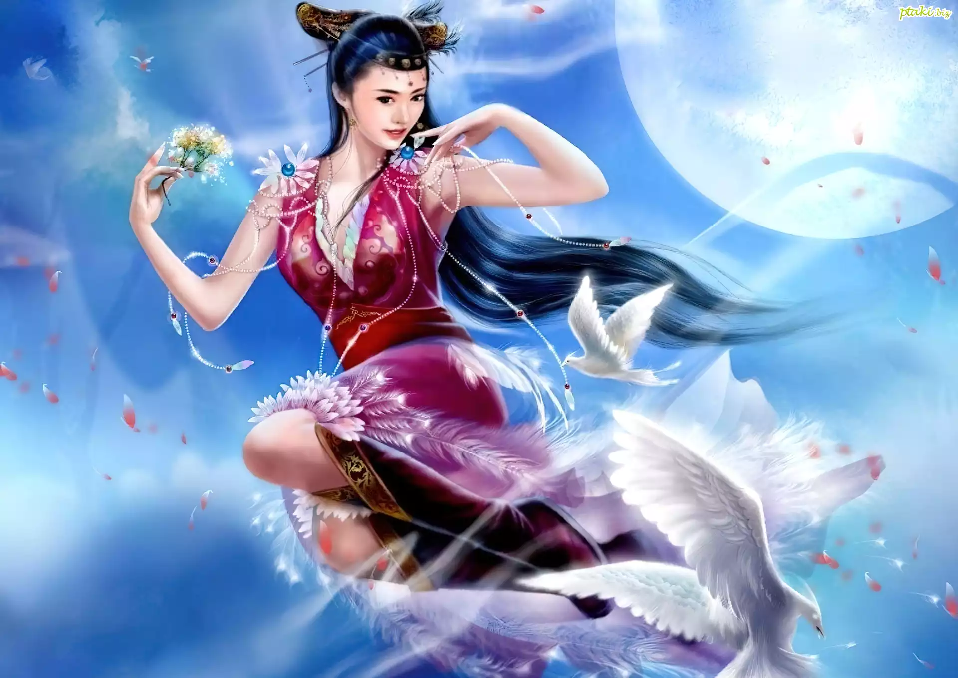 Kobieta, Czerwona, Suknia, Niebo, Gołębie