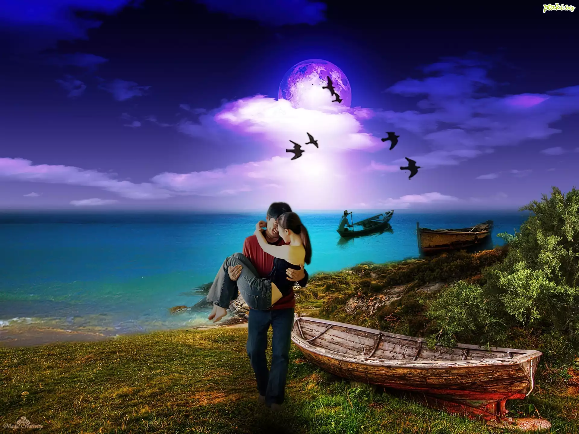 Kobieta, Mężczyzna, Łódki, Morze, Ptaki, Chmury