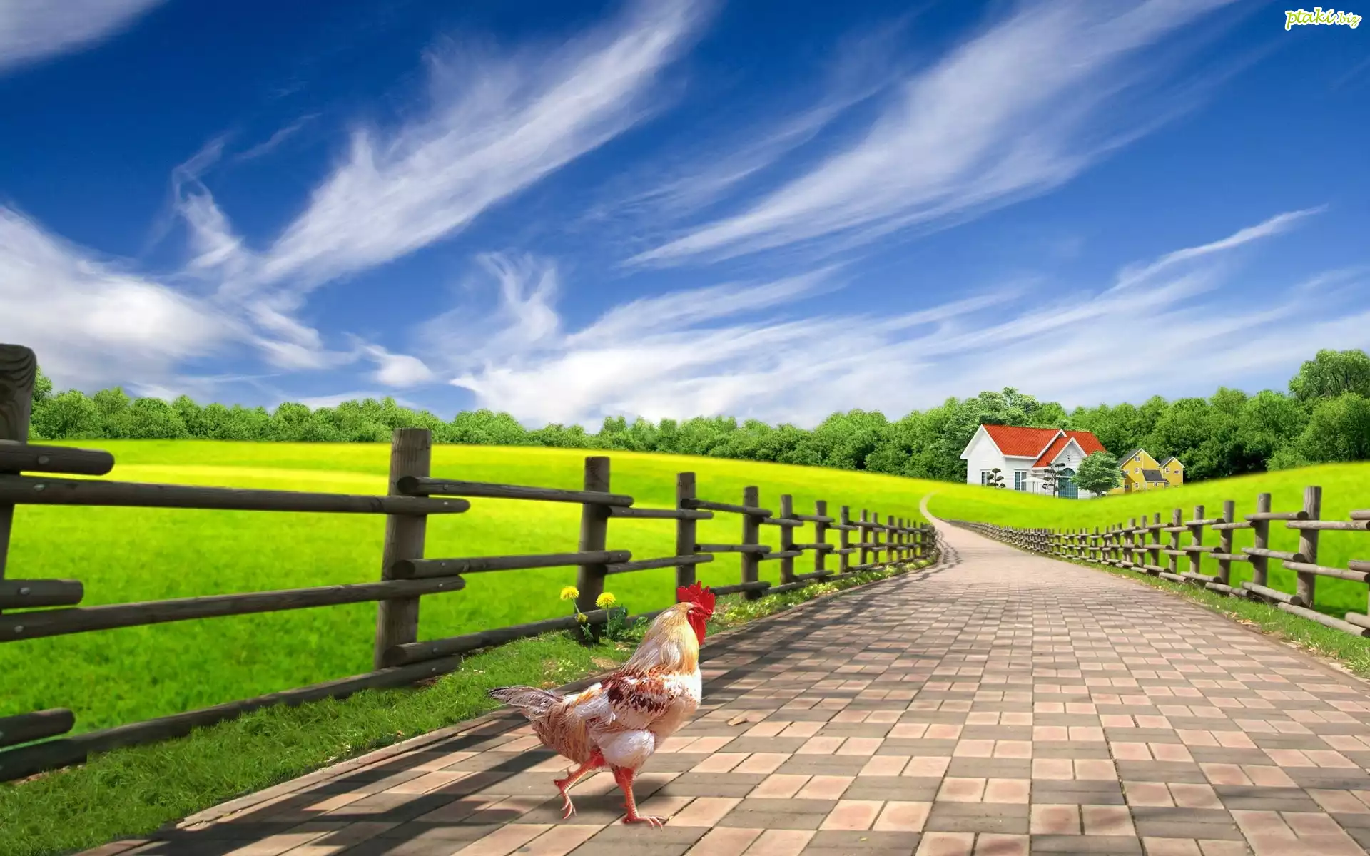 Kogut, Droga, Łąka, Zagroda, Dom, Niebo