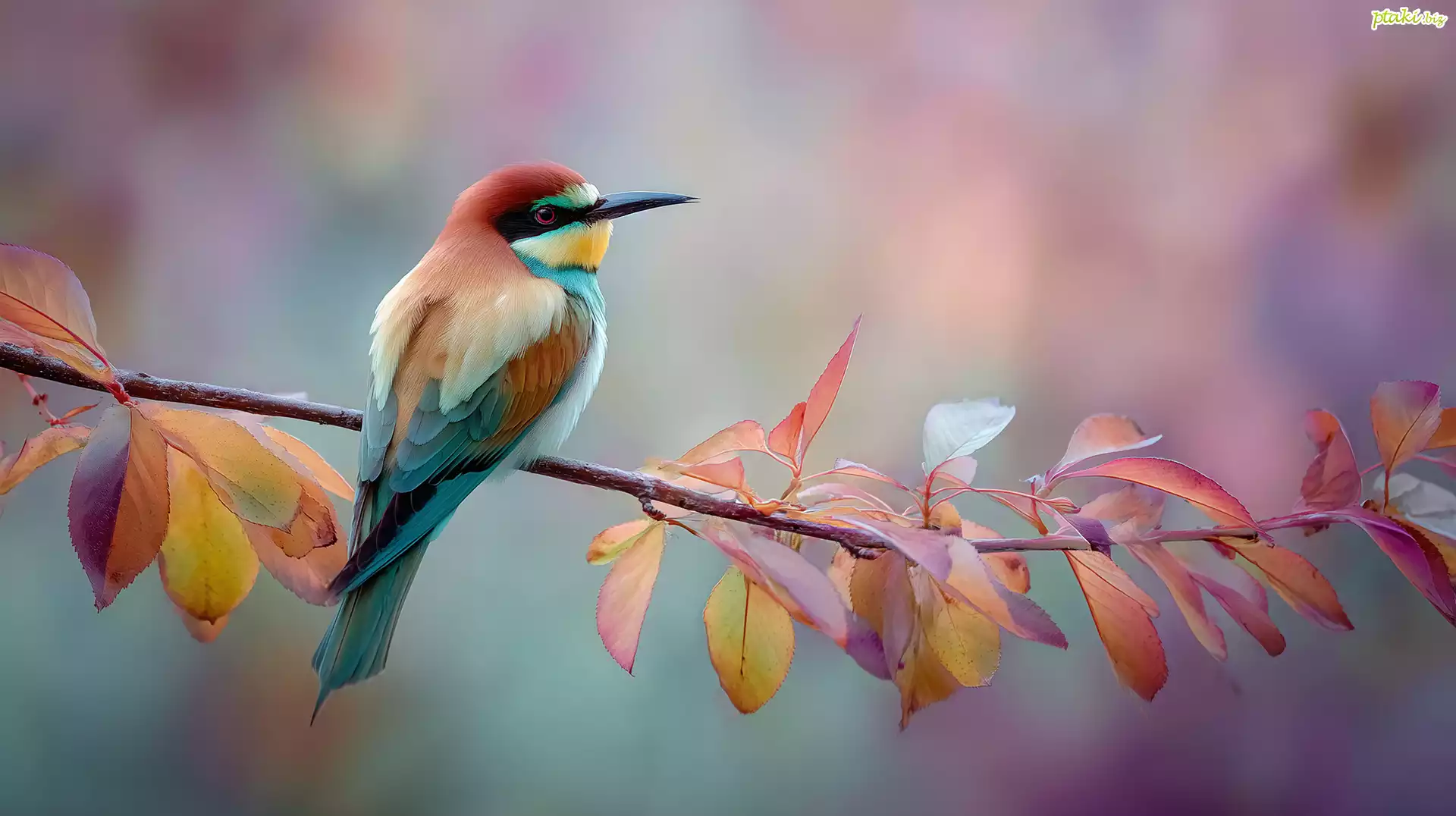 Żołna, Ptak, Gałązka, Kolorowe, Liście, Grafika AI