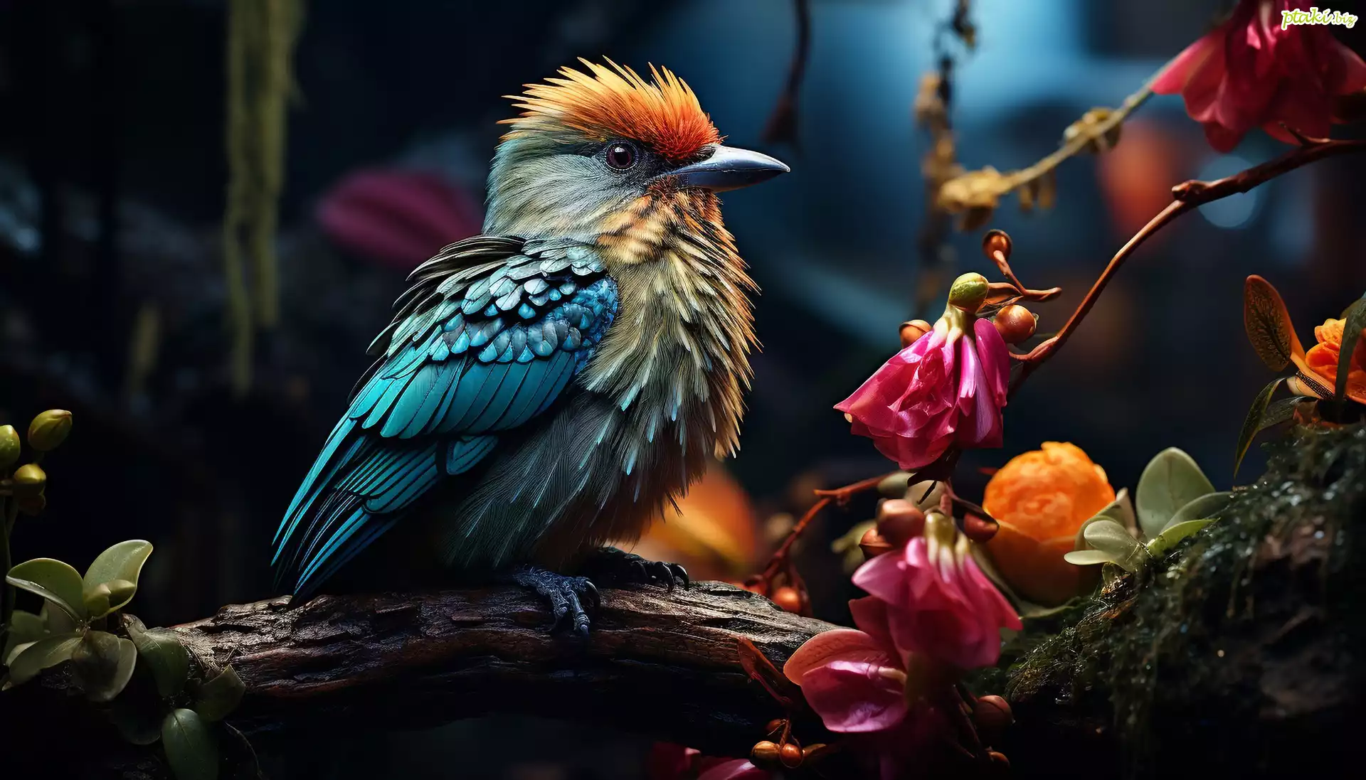 Kolorowy, Ptak, Gałąź, Kolorowe, Kwiaty, Grafika