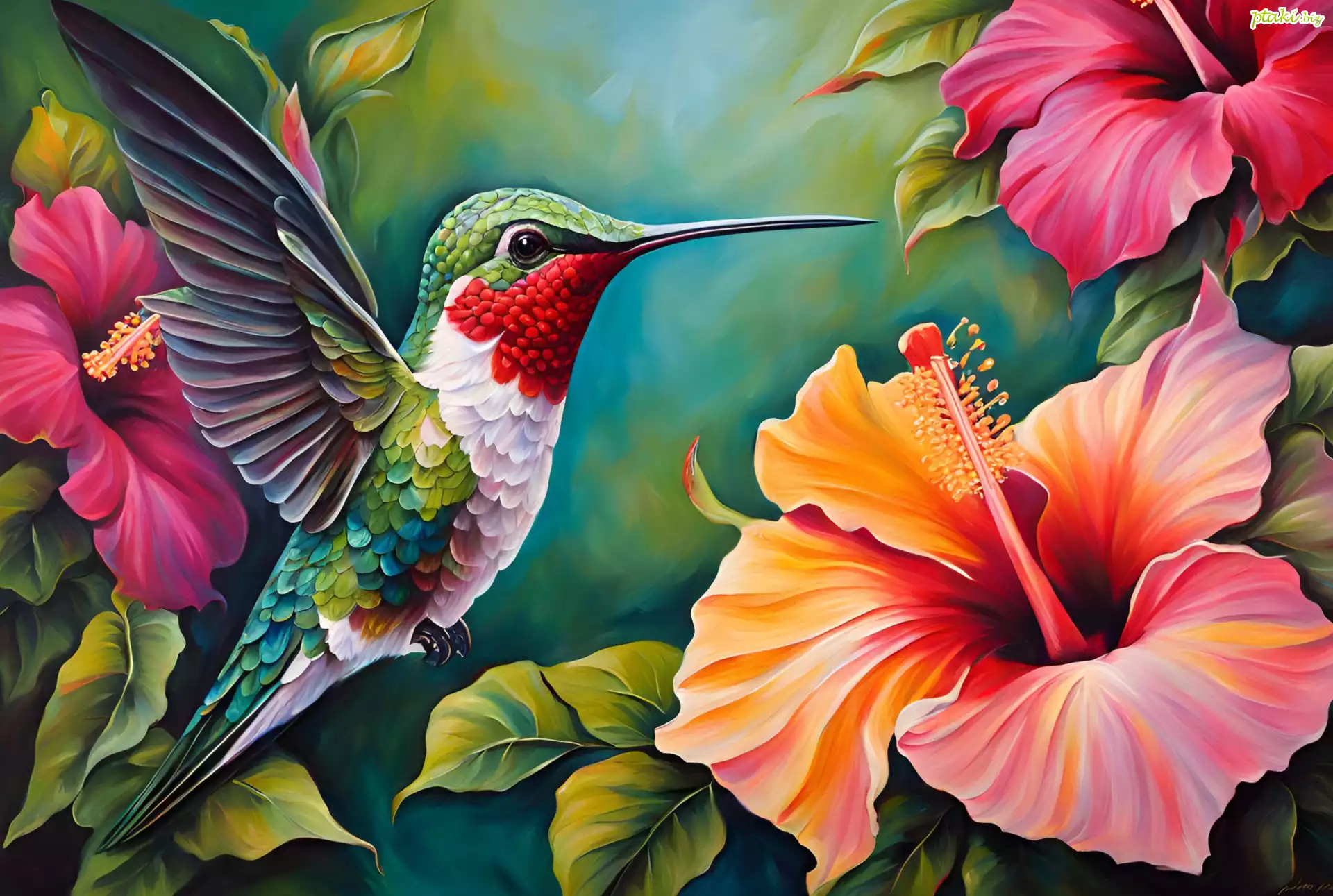 Ptak, Koliber, Hibiskus, Kolorowe, Kwiaty, Liście, Grafika