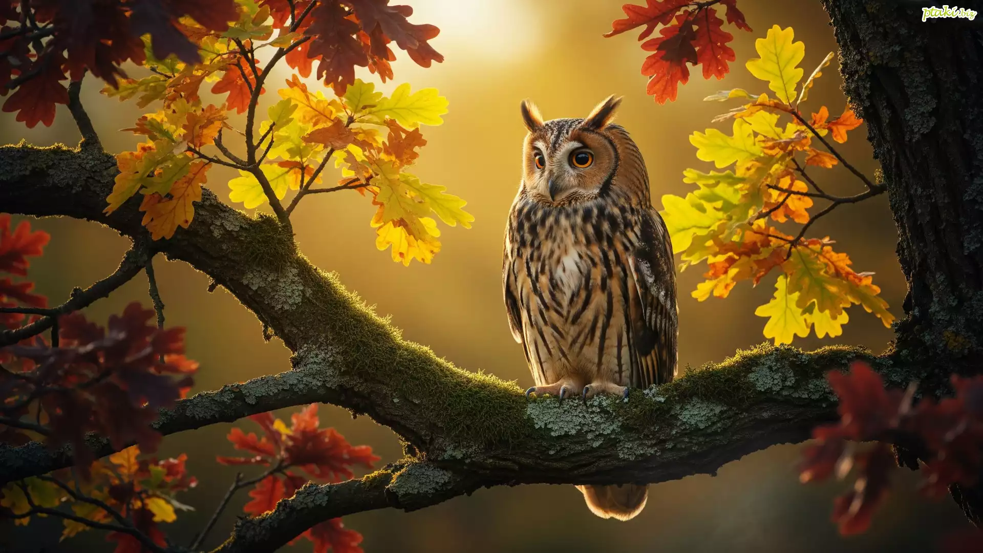 Ptak, Sowa uszata, Drzewo, Dąb, Gałązka, Kolorowe, Liście, Jesień Sowa Uszata