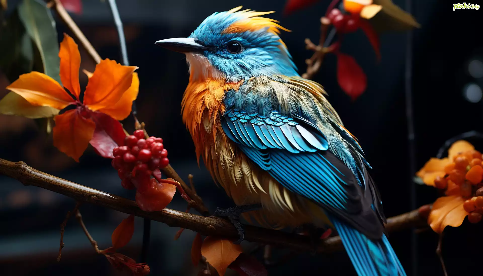 Ptak, Kolorowy, Gałąź, Liście, Grafika