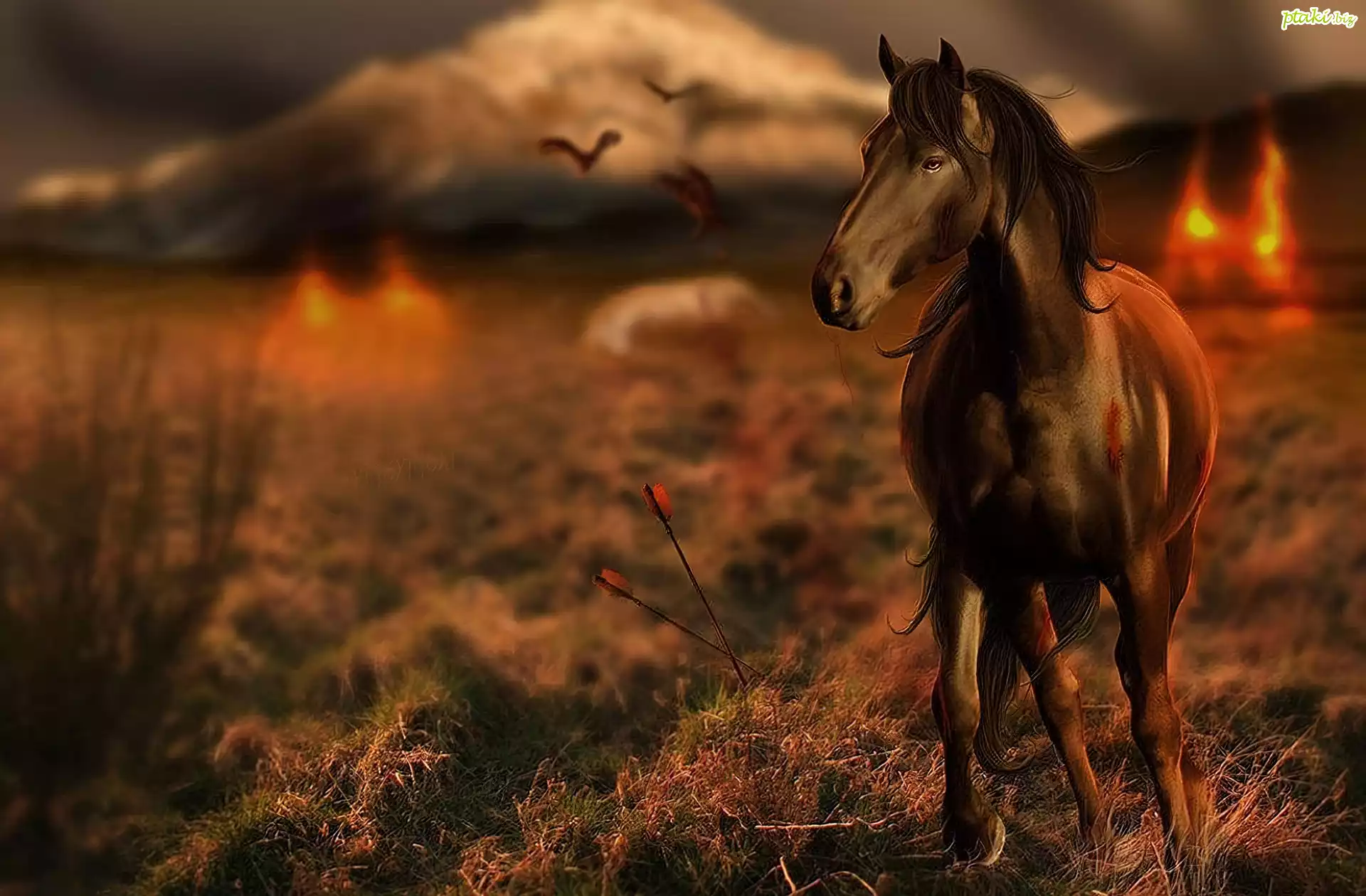Koń, Łąka, Zachód, Słońca, Ptaki