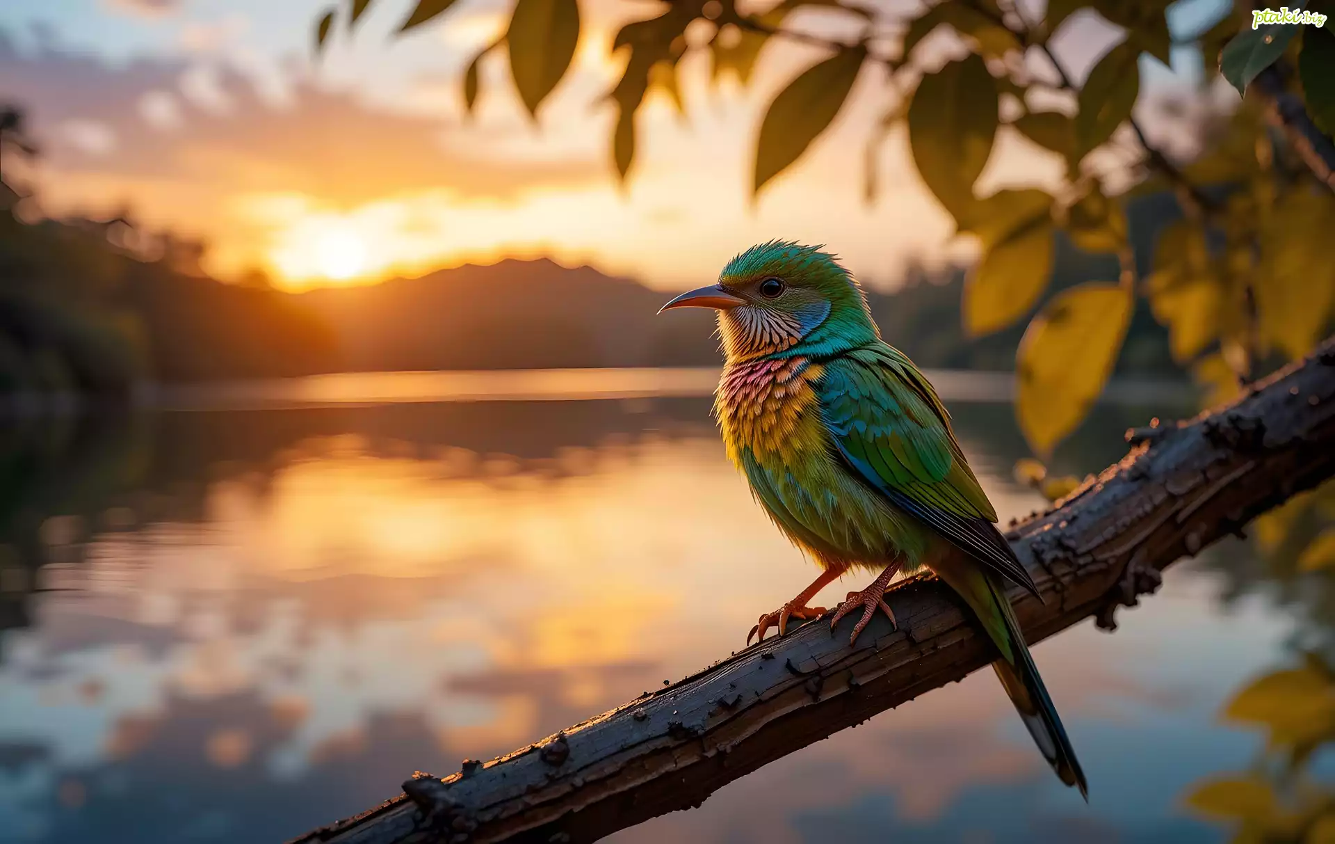 Zielono-pomarańczowy, Ptak, Konar, Grafika AI