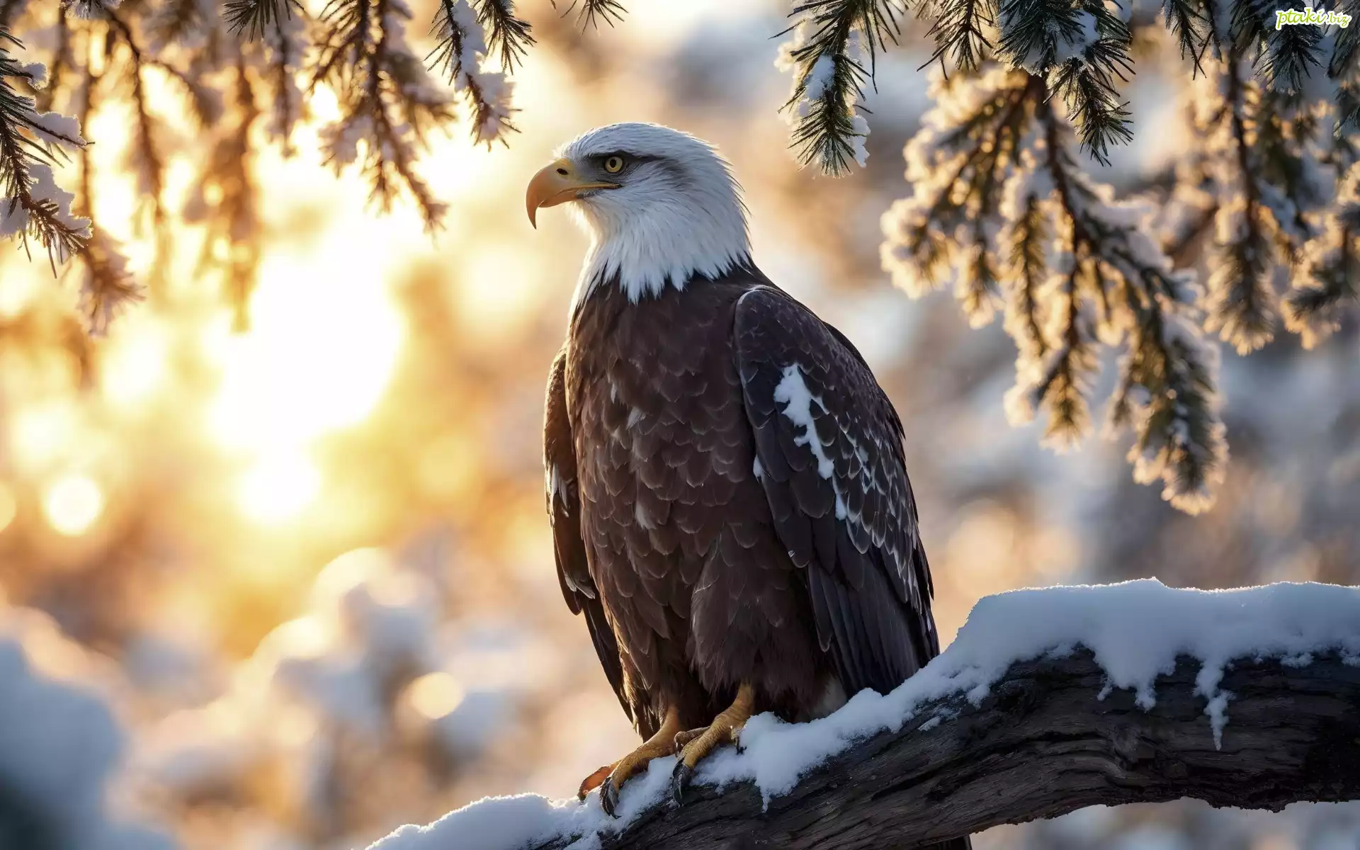 Ptak, Bielik amerykański, Konar, Gałązki, Śnieg, Światło