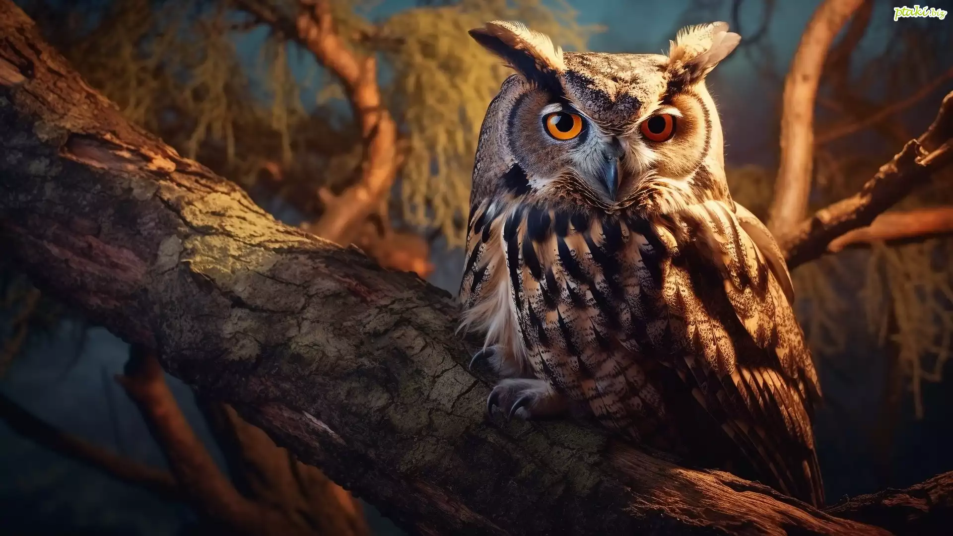 Sowa, Puchacz, Drzewo, Konar, Noc, Blask