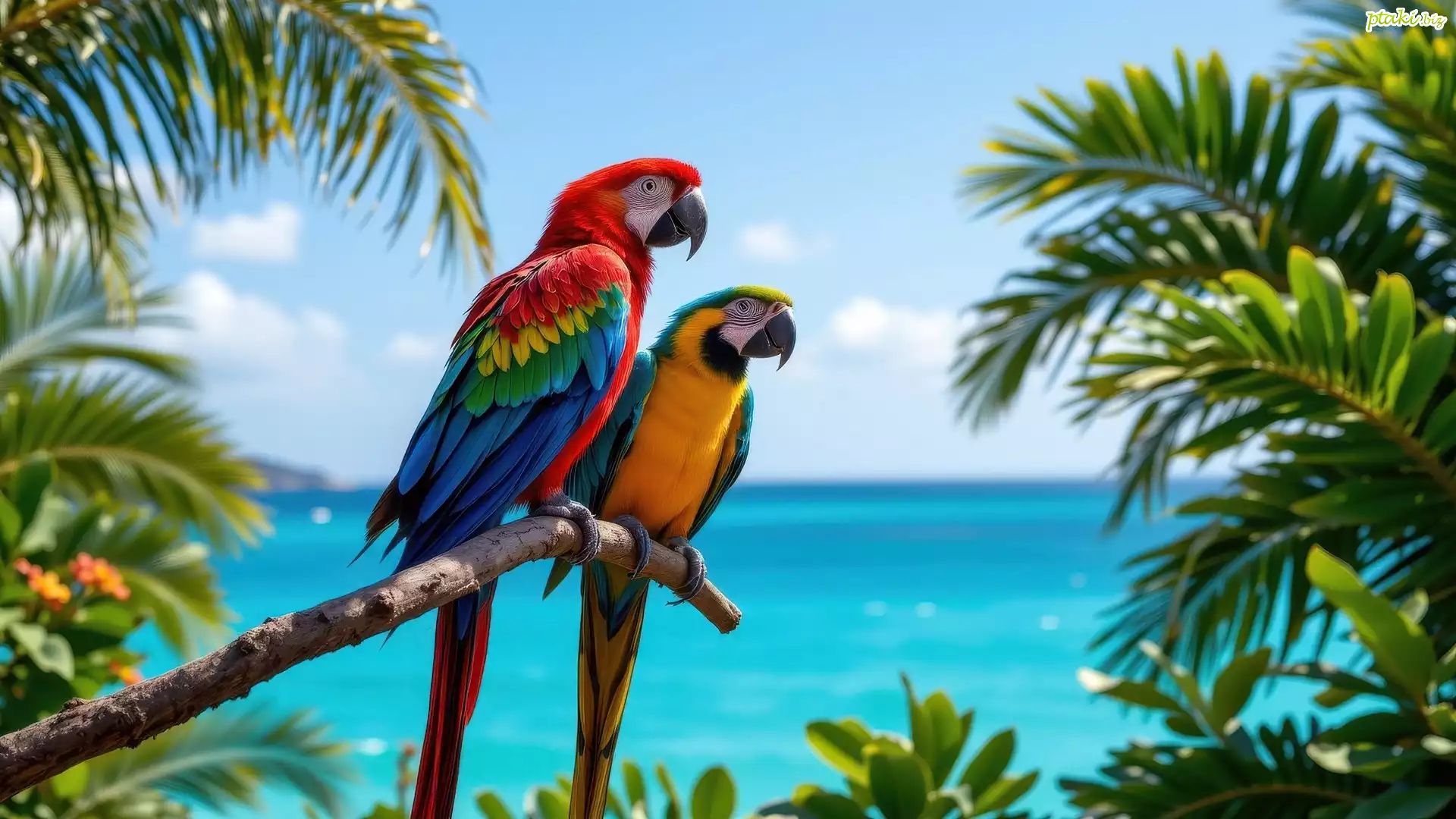 Dwie, Papugi, Ary, Konar, Rośliny, Morze