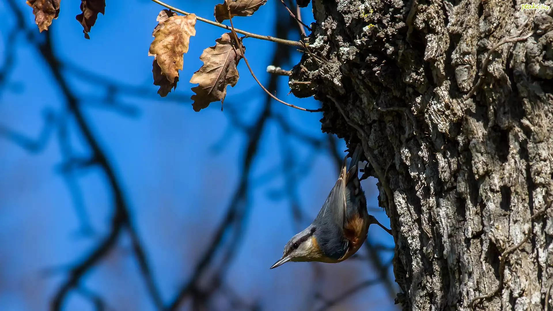 Ptak, Kowalik zwyczajny, Drzewo, Dąb, Gałązki, Liście