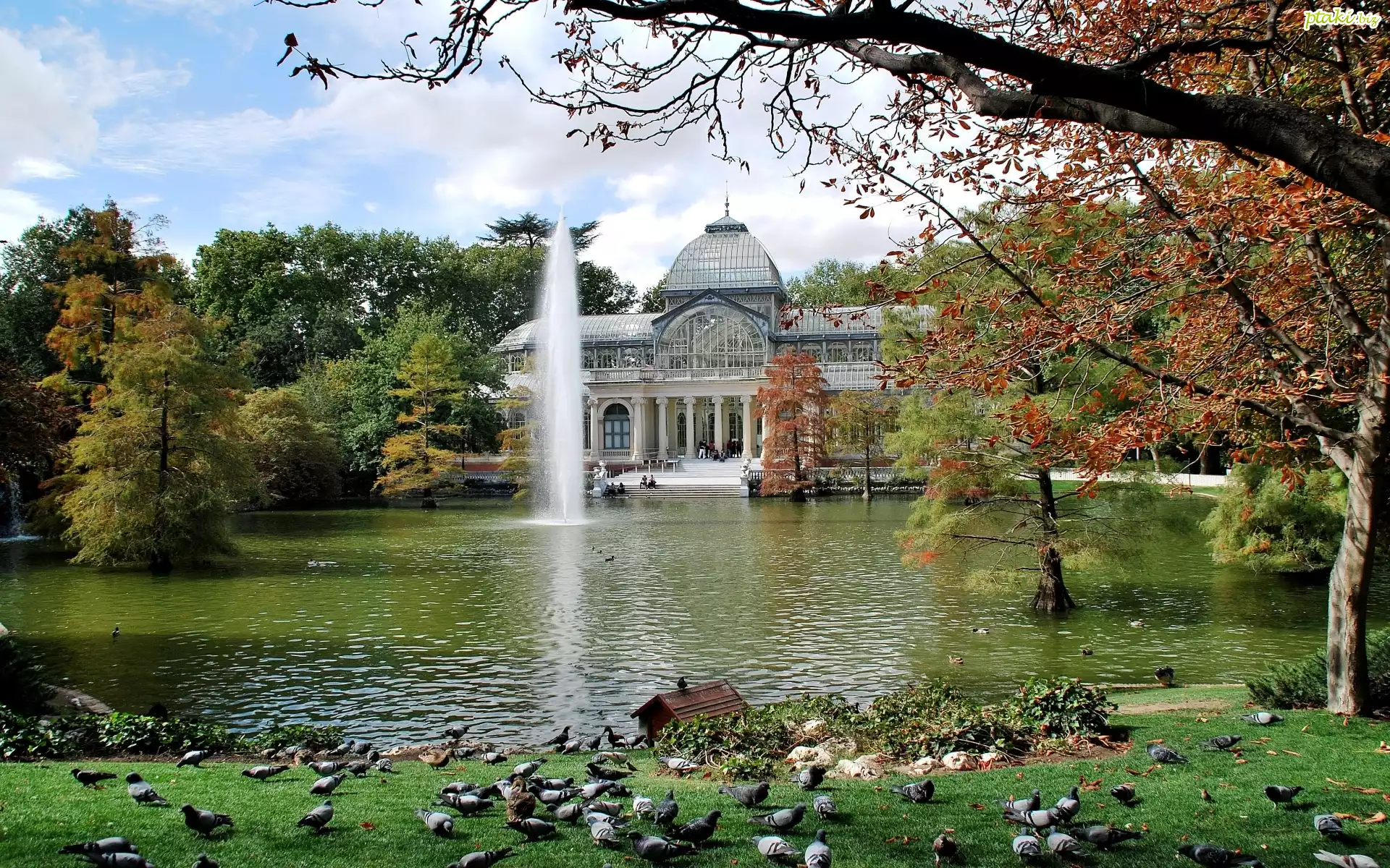 Pałac, Kryształowy, Fontanna, Park, Gołębie, Madryt, Hiszpania