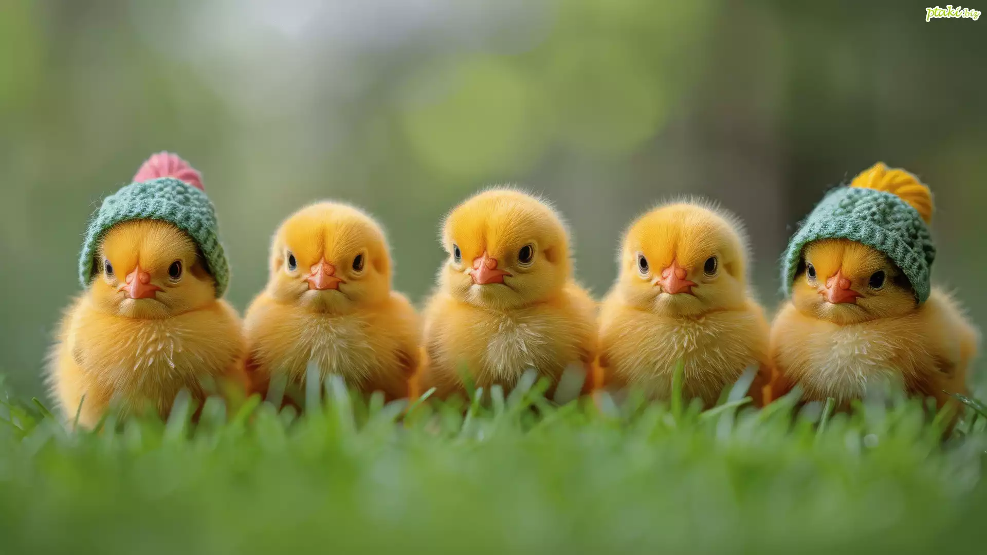 Małe, Kurczaki, Pięć, Kurczaczków, Czapki, Trawa