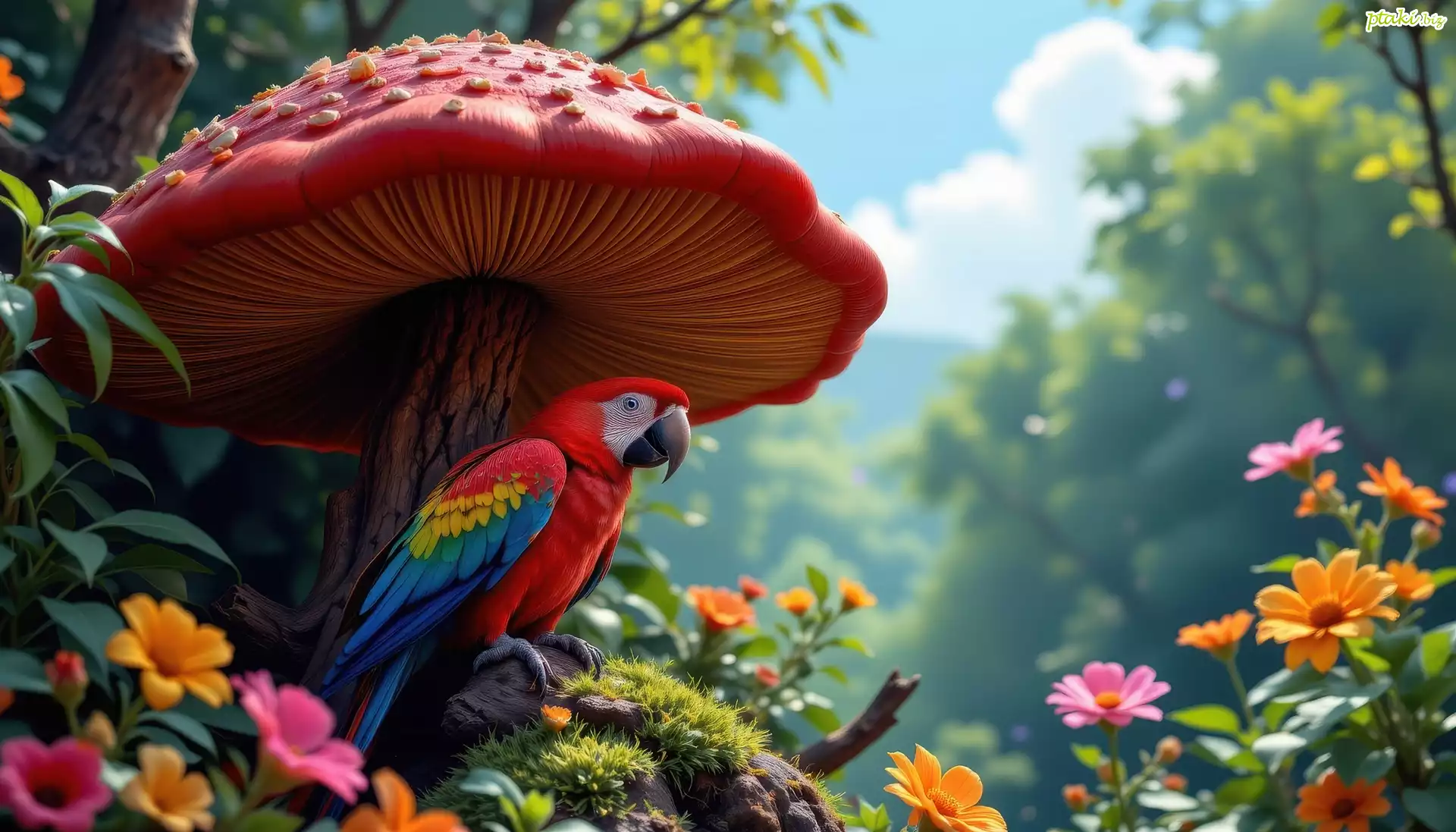 Grzyb, Papuga, Ara, Kwiaty, Grafika AI
