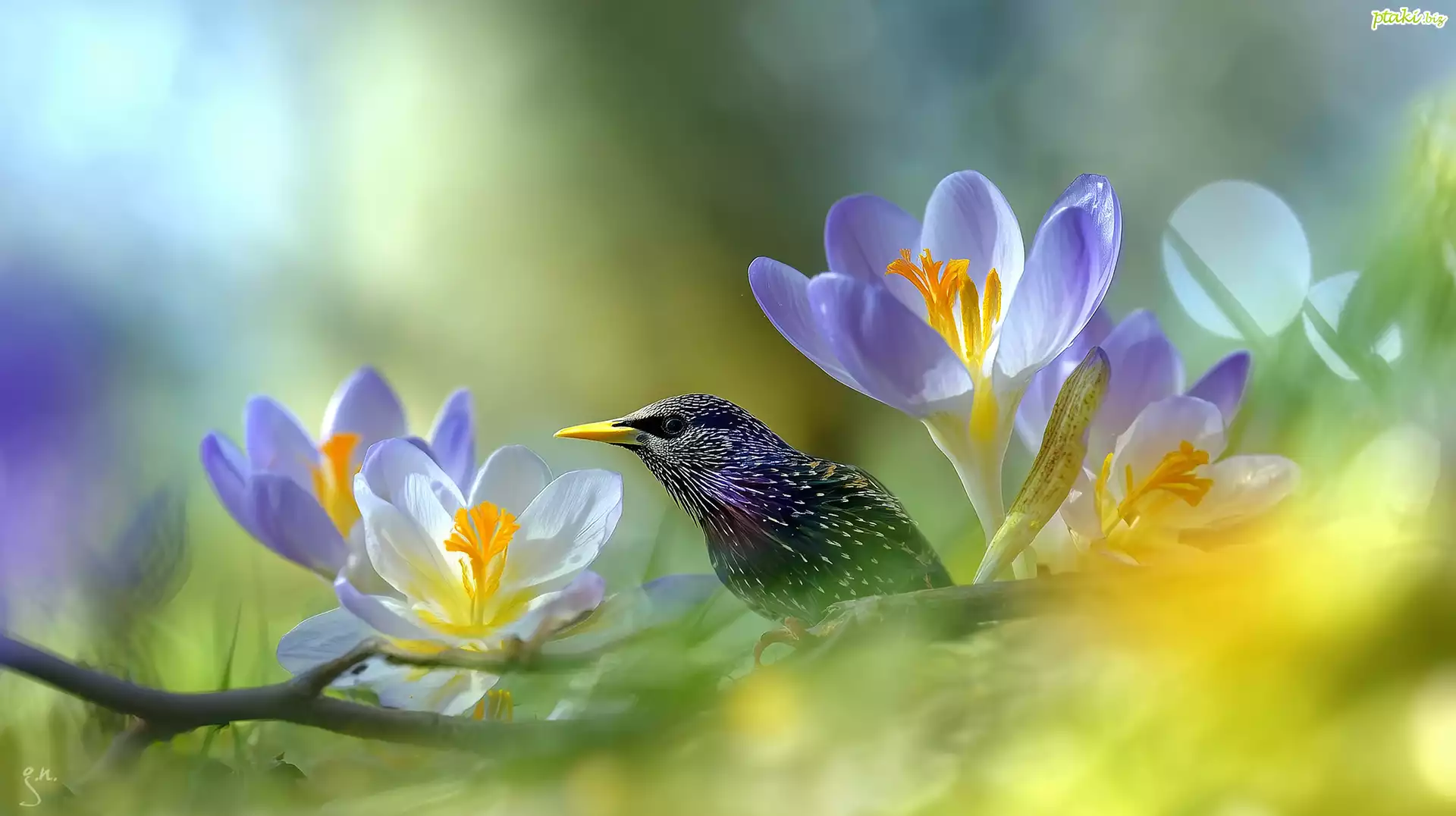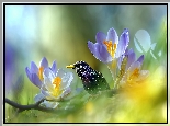 Szpak, Ptak, Krokusy, Kwiaty, Grafika AI