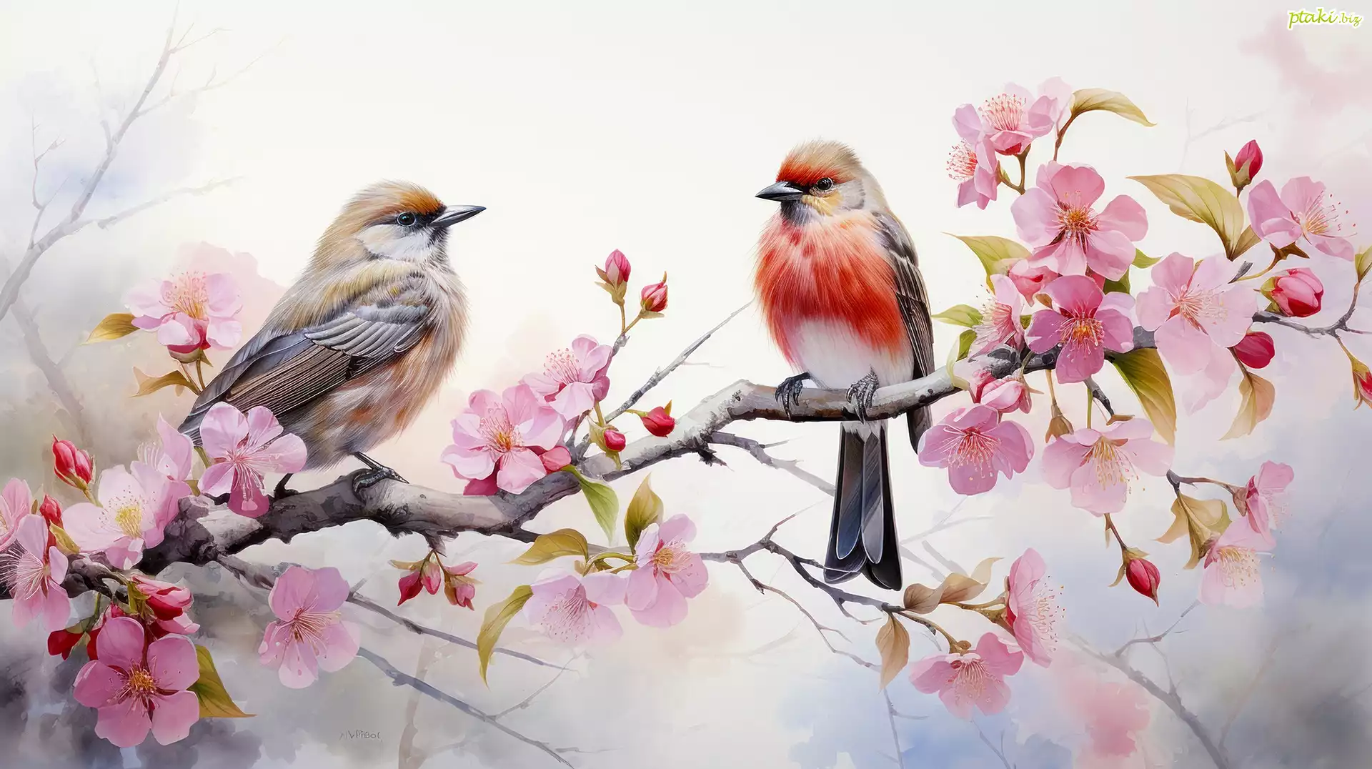 Kolorowe, Ptaki, Gałąź, Kwiaty, Wiosna, Grafika