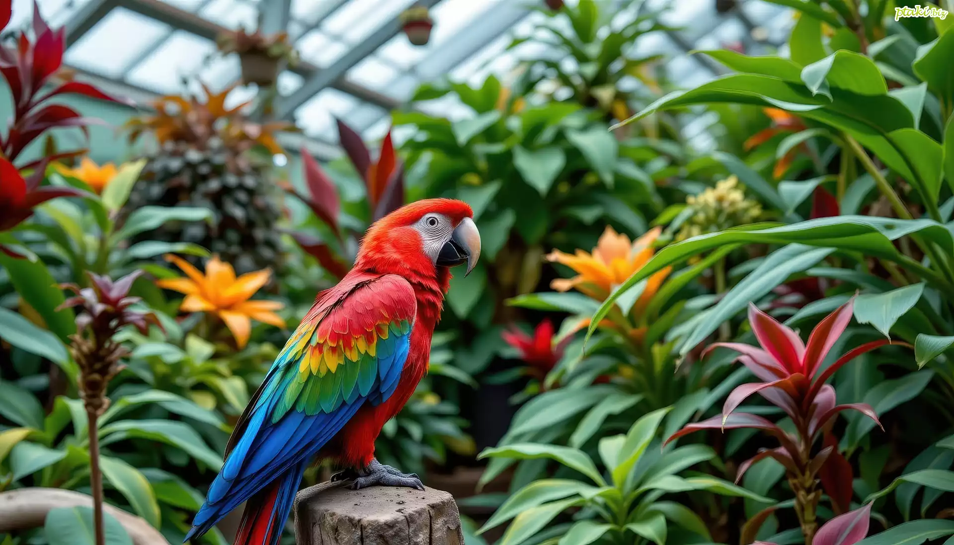 Papuga, Ara, Oranżeria, Kwiaty, Rośliny, Grafika AI