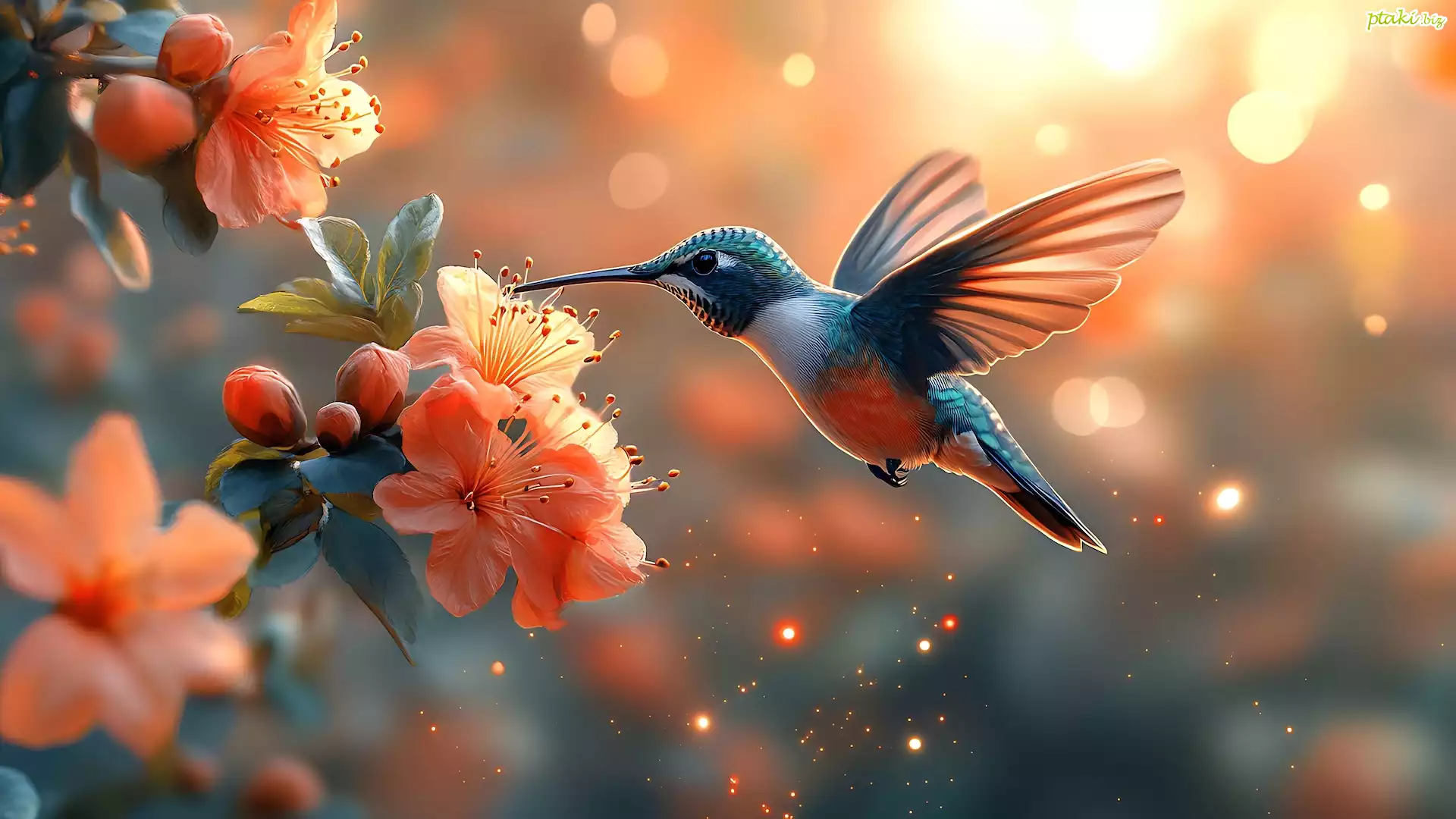 Ptak, Koliber, Pomarańczowe, Kwiaty