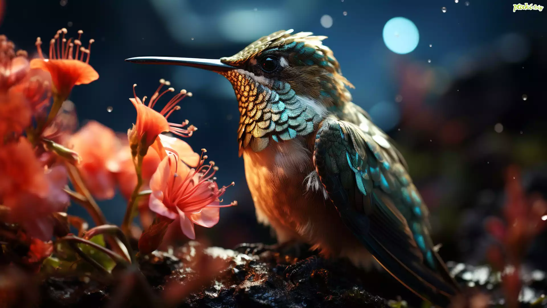 Ptak, Koliber, Pomarańczowe, Kwiaty, Ciemne tło
