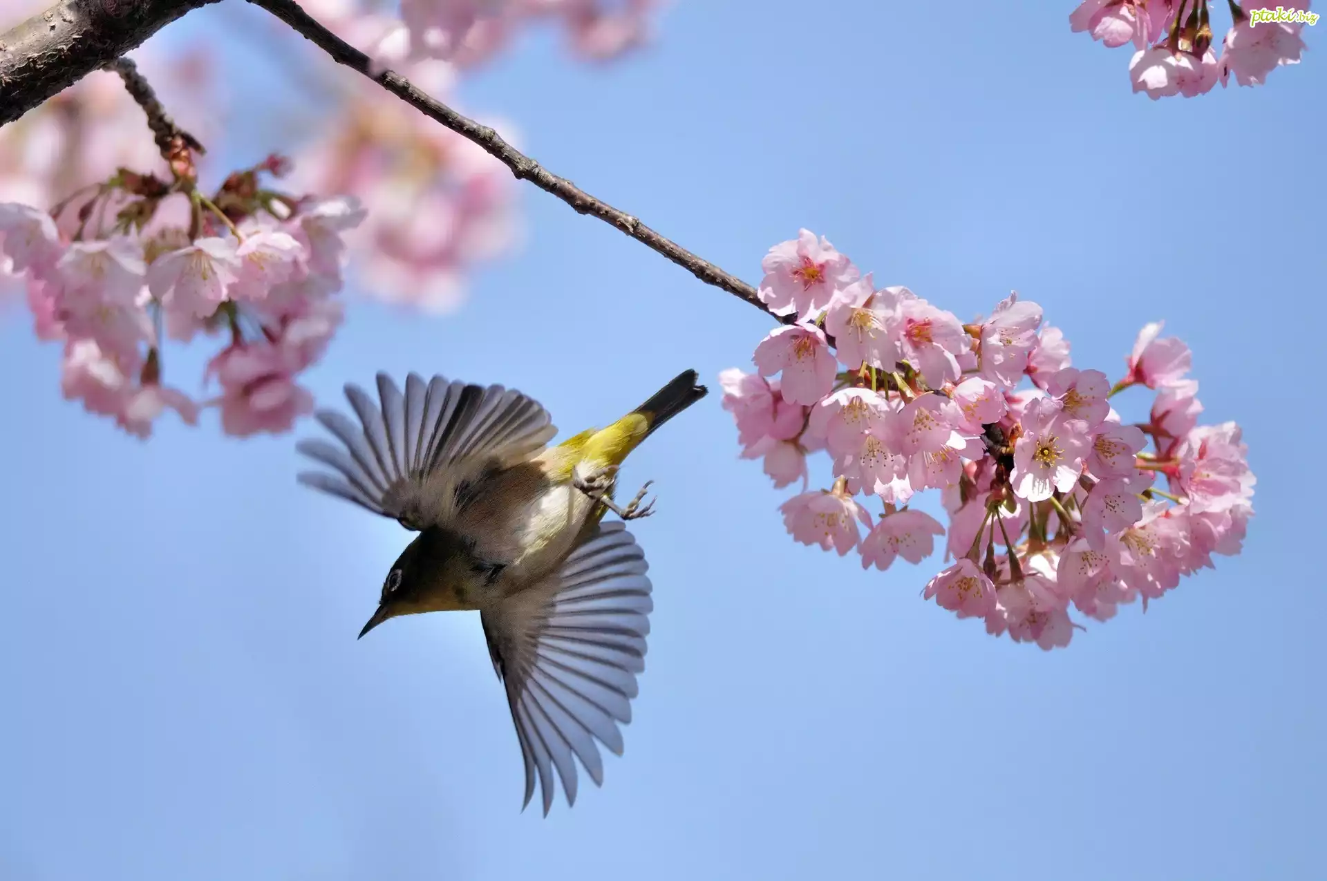 Kwitnąca, Gałązka, Wiśni, Ptaszek, Lot