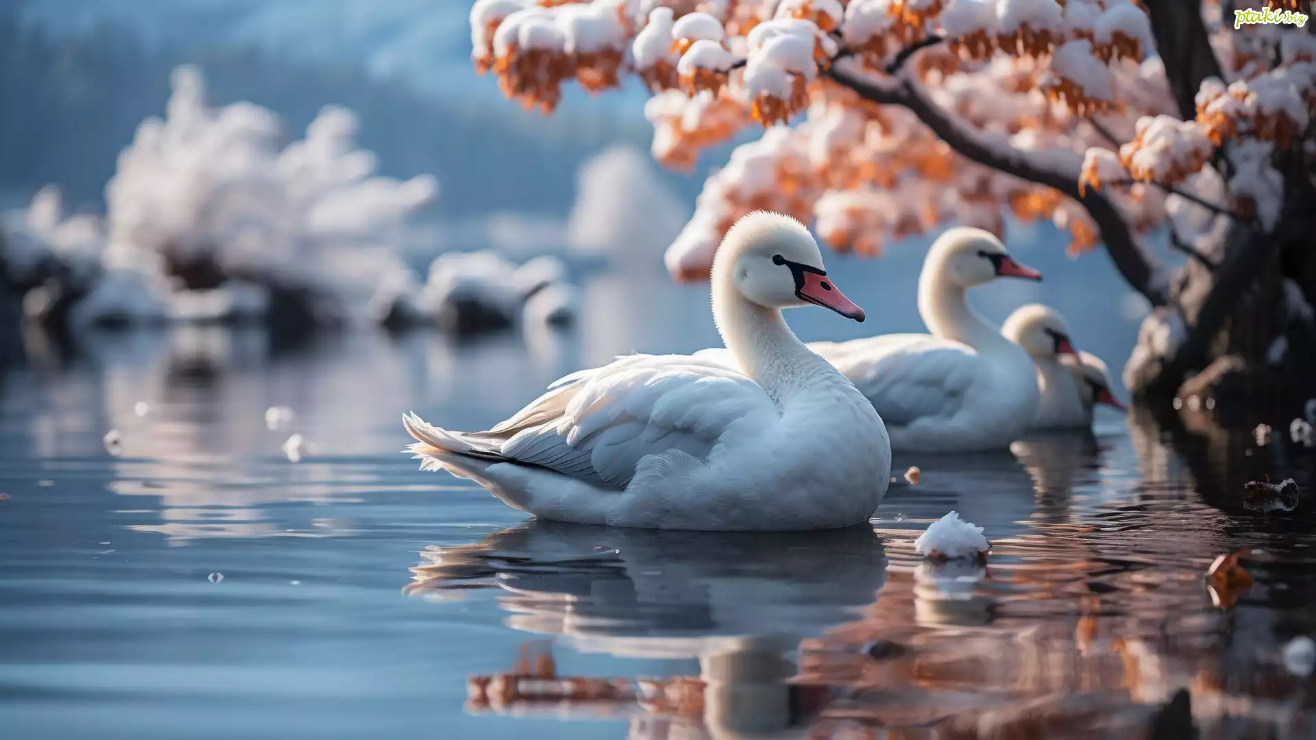 Grafika, Zima, Jezioro, Łabędzie, Ośnieżone, Drzewa