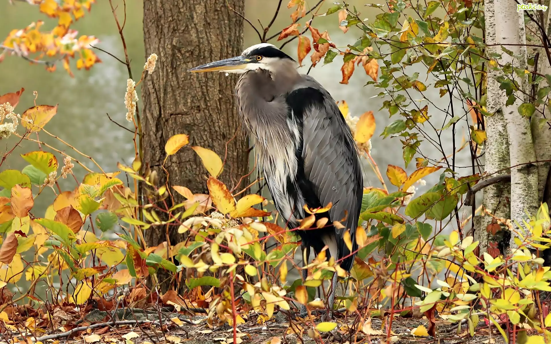 Las, Jesień, Drzewa, Czapla