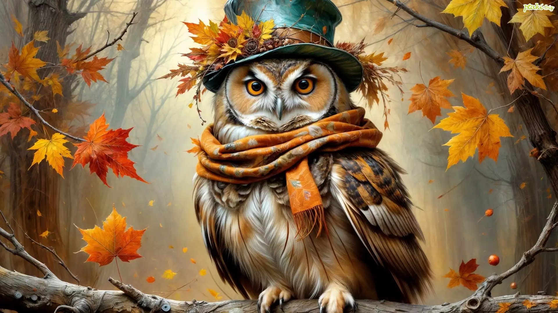 Sowa, Czapka, Szalik, Las, Jesień, Grafika